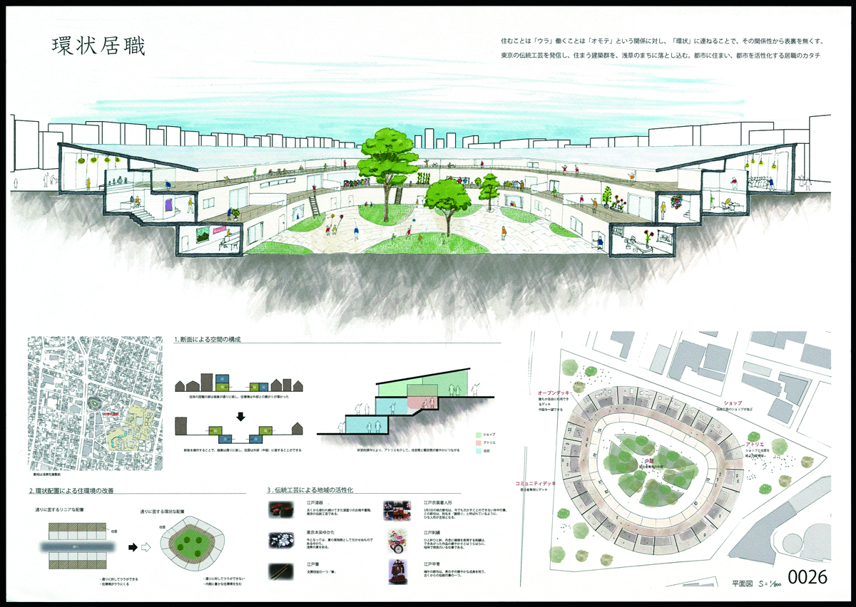 住むことは「ウラ」 働くことは 「オモテ」という関係に対し、「環狀」に連ねることで、その関係性から表裏をなくす。従來の居職の家は商業が通りに面し、住環境は外部とのつながりが薄かった。斷面を操作することで、商業は通りに面し、住居は外部(中庭)に面することができる。東京の伝統工蕓を発信し、住まう建築群を、淺草の街に落とし込む。都市に住まい、都市を活性化する居職のかたち。 (応募案より抜粋)