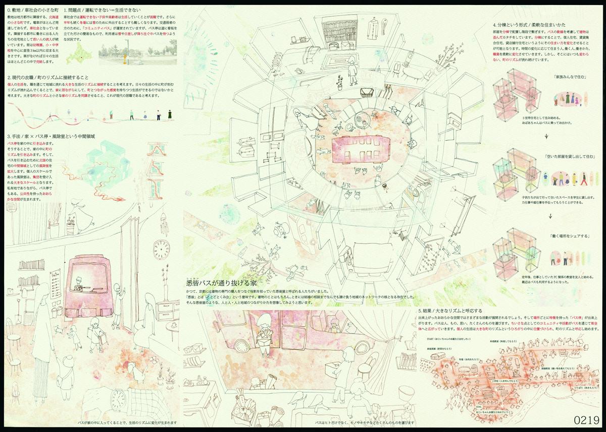 かつて、京都には著物の専門の職人をつなぐ役割を擔う「悉皆屋」と呼ばれる人たちがいた。著物のことはもちろん、時には結婚の相談まで何でも請け負う地域のネットワークの核となる存在だった。そんな「悉皆屋」のような、人と人?人と地域のつながり方を考える。敷地は地方都市に隣接する北海道の小さな街。職を通じて街のリズムと個人の家のリズムを同調させるため、バス停を家の中に引き込む。小さな點としてのコミュニティや活動が、バスを通じて街全體へと広がっていく。 (応募案より抜粋)