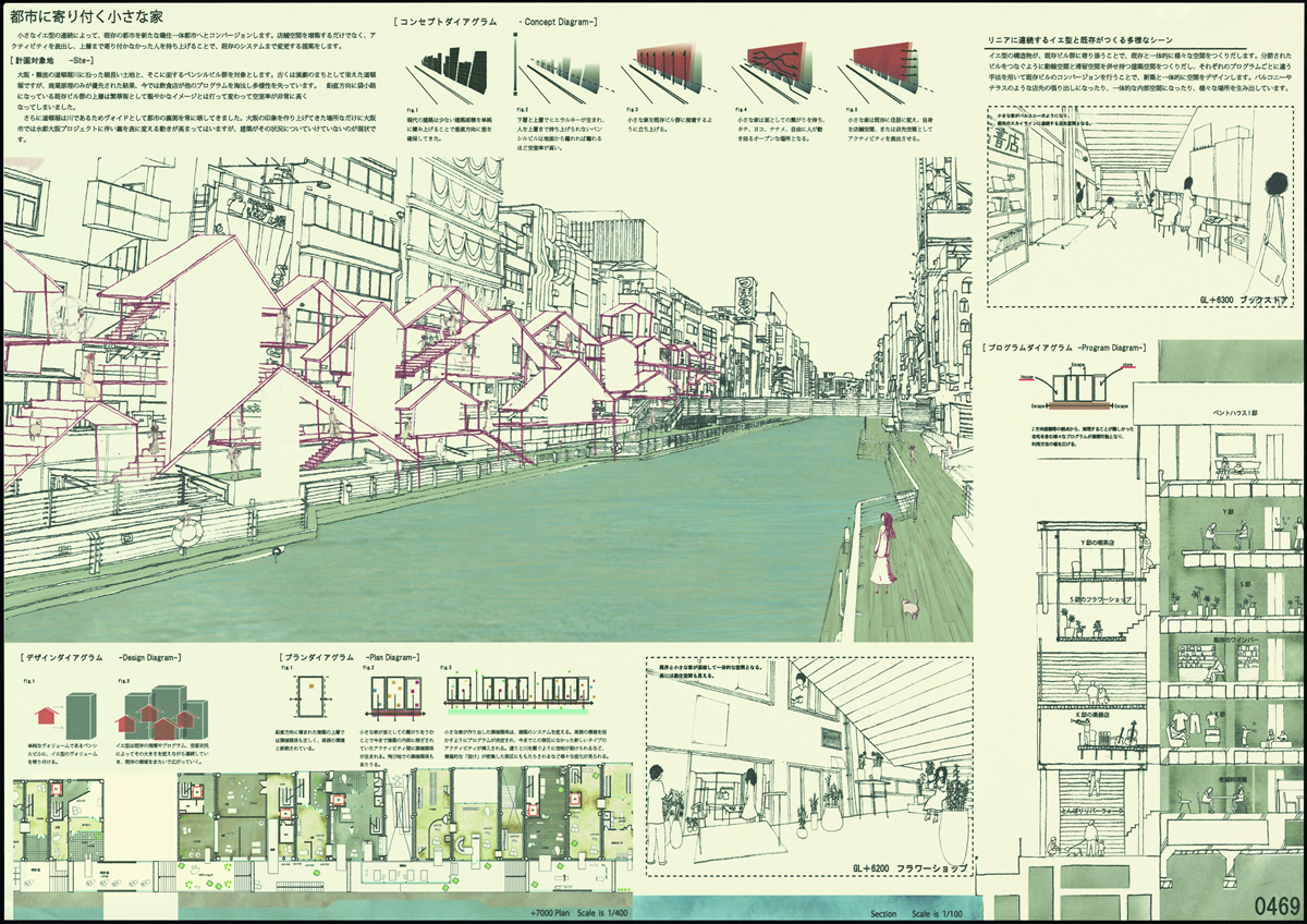 わずか10m2の小さな建物をもう一度街の中に置くことで、さまざまな仕事を展開し街を活性化しようという、非常に現実的なアイデア。そのダイアグラムだけで、新しいミゼットハウスの形がデザインされていないのが殘念。 (山本理顕)