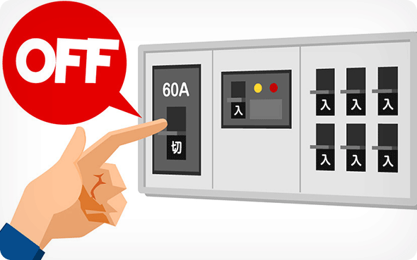 復(fù)舊時(shí)は通常時(shí)と同じ手順で、アンペアブレーカー→メインブレーカー(漏電遮斷器)→安全ブレーカーの手順で「入」にし、漏電箇所がないか確認(rèn)しましょう。