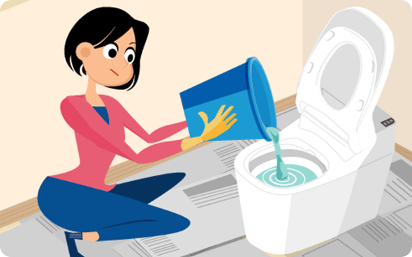 斷水中は水を使用できなくなり、通常の便器洗浄ができなくなります。そのような場(chǎng)合には水を流し込むことで、便器洗浄が可能です。バケツ1杯(8L程度)の水を?水飛びに注意しながら直接便器內(nèi)へ一気に流し込んでください。さらに靜かに3~4Lの水を流してください。小便はまとめて流し、トイレットペーパー等は流さずごみとして捨てます。