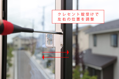 クレセントの本體側で上下を、受け側で左右の位置を調整できます。両方を組み合わせて、きちんとカギがかかる位置を探しましょう。