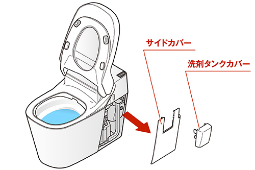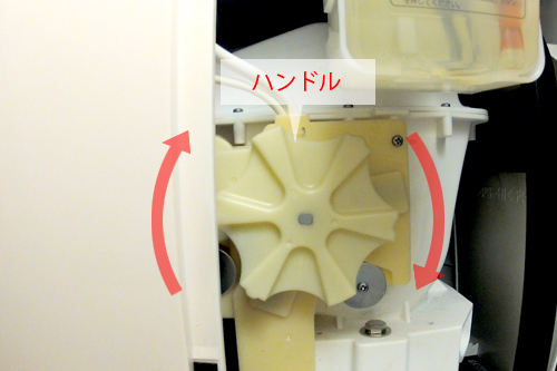 PanasonicアラウーノSは、排水の構造が一般的なトイレと異なります。便器にたまった水は、通常は電動で排水されます。排水口がつまったり、停電や斷水が起きたりした場合には、ハンドルを手動で回して排水する必要があります。