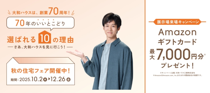 ●大和ハウスの公式WEBサイトから「住宅展示場」の来場予約を初めてご利用される方に限らせていただきます。●後日、次回の商談予約をキャンセルされた場合、「Amazon ギフトカード 3,000 円分」の景品獲得の権利は無効となります。●専用のプレゼント応募用フォームに登録していただくAmazon ギフトカード送信用の情報は、ご予約時に登録していただいた情報(氏名、電話番号、メールアドレス)と同じ内容にしてください。●1家族さま 1回限り。●未成年者のみのご来場はご遠慮ください。●プレゼントは後日お渡しとなります。●大和ハウスより、ご登録いただいたメールアドレス宛に、2026年1月末頃にプレゼント受け取り用URLをご案内する予定ですが、状況によりご案内時期が変更となる場合がございます。●メールアドレスの登録間違い、受け取り側の受信設定などが理由でメールの受け取りができない場合は、賞品獲得の権利は無効となります。受信拒否や迷惑メールフォルダに振り分けされないよう、「