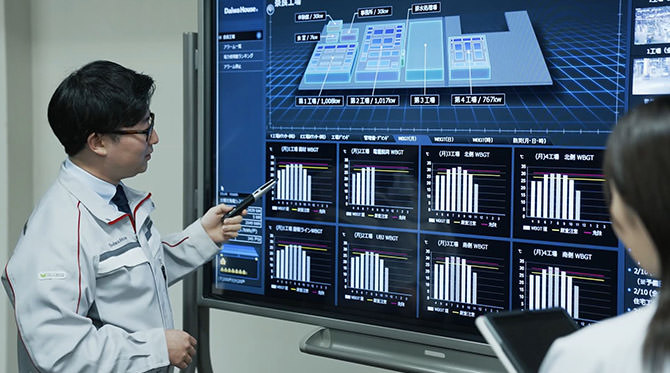 大和ハウスグループは、溫室効果ガス排出の実質ゼロを目指すカーボンニュートラル戦略を進めています。工場では、カーボンニュートラルの実現に向けて、D’s FEMS(※)を用いた省エネ活動の推進、化石燃料使用機器の電化を実施。工場建屋の更新時には、再生可能エネルギーの導入を実施しています。