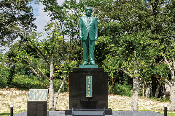 立像は、1993年ごろの石橋信夫をモデルに、在りし日の姿を現しています。生誕の地である奈良?吉野と大和ハウス工業本社を望み、大和ハウスグループの未來を見守っています。