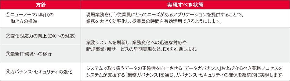 そこで、レガシーシステムのモダナイゼーション(*3)に取り組み、これからの當(dāng)社グループにおける「事業(yè)の多角化?ビジネス成長(zhǎng)」、「営業(yè)スタイルの変革」、「働き方改革への対応」など社內(nèi)外の環(huán)境変化に迅速に対応できるDXを支える基盤へと刷新します。(表1)