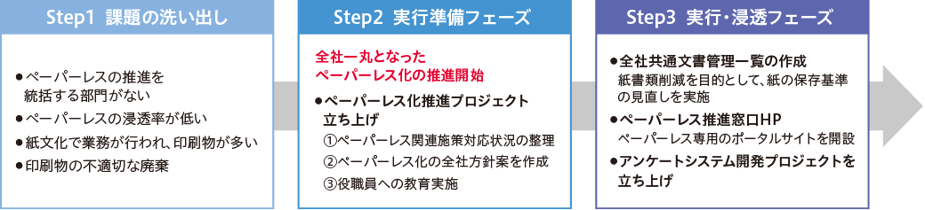 今までは、ペーパーレス化の対応を各部門主導で行ってきました。しかし、昨今の急速なテレワークの推進や情報漏洩に対する情報漏洩対策強化に対する社會要請、またこれから到來するデジタル社會に本格的に対応できる経営基盤づくりを行うため、ペーパーレスは會社全體の経営課題であると認識し、全社を挙げてペーパーレスを推進するためのプロジェクトを立ち上げ、取り組んできました。