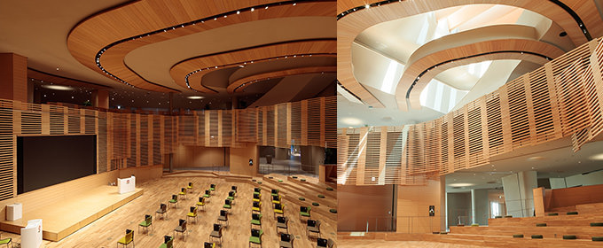 吹抜けから光が降り注ぐ、ダイナミックで開放的なホール。木材仕上げで、溫かな雰囲気と柔らかな音環境が特徴。