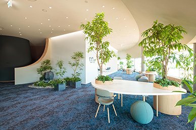 多くの植物やアロマ?自然環境音?影のできない光幕照明などにより、深い集中ができる研修室。