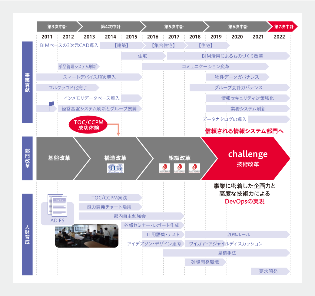 情報システム部門ではこれまで、IT中期計畫に合わせて基盤改革?構造改革?組織改革?技術改革に取り組んできました。(図2)