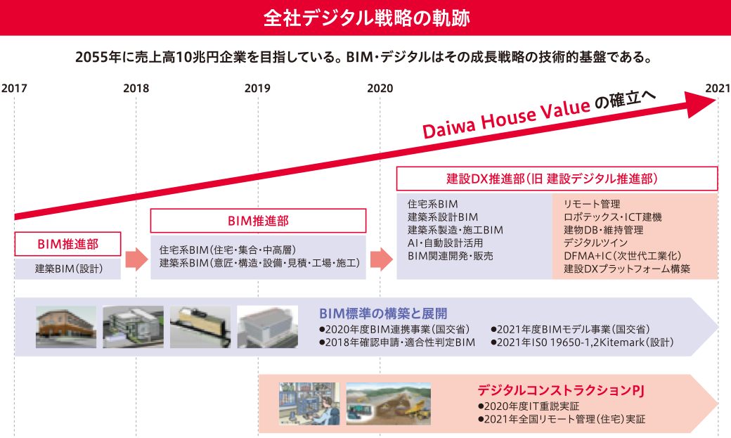 當社は、建設プロセスを単にデジタル化することから今一歩ふみ込み、BIM(*1)情報を高度に利活用することで、建設プロセスの改革を実現すること、すなわち「建設DX」を実現し、2055年にグループ売上高10兆円を達成するための技術基盤を構築することを目的としています。