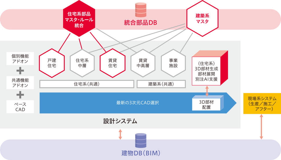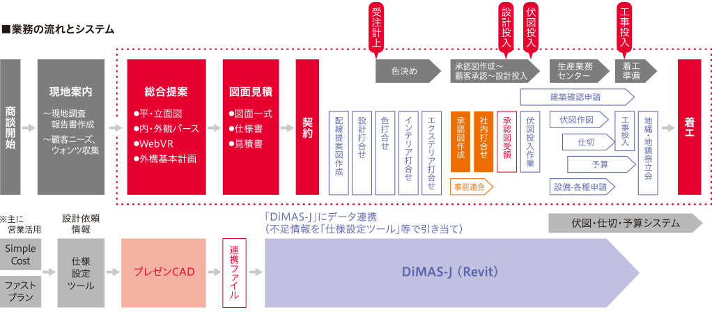 現在はBIMに対応した3次元CAD(Revit)をベースとして、住宅?集合それぞれの商品特長に対応したカスタマイズを実裝し、全國展開しています。(住宅:DiMAS-J、集合:DiMAS-S) カスタマイズは、各種部品等の入力作業を補助する仕組みや部品の自動生成機能、法規チェックや構造計算結果の適正なフィードバックによる自動設計などに結び付けるための機能強化が主となっています。