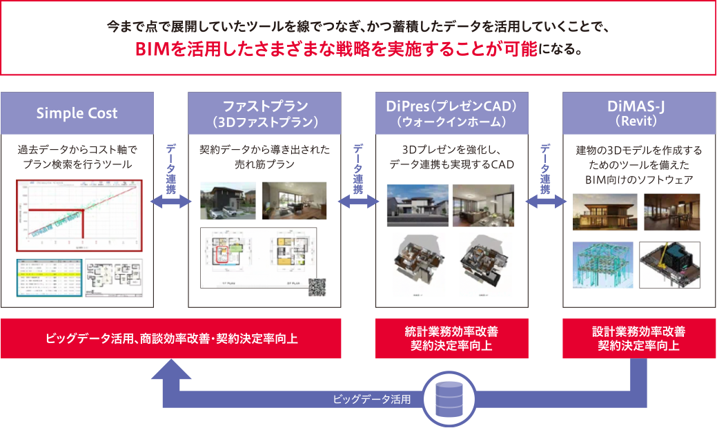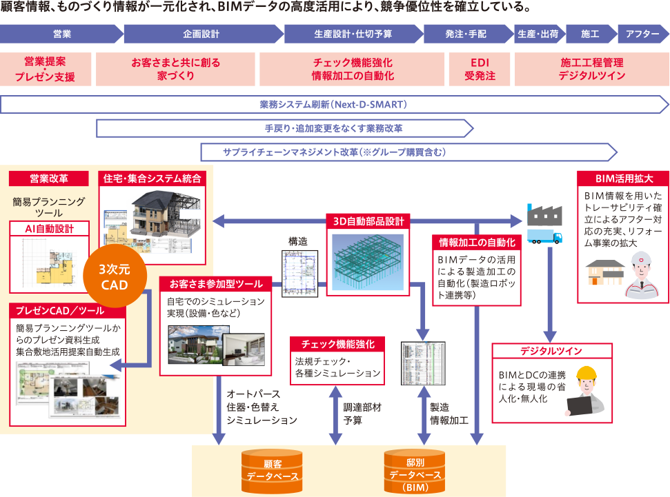 住宅系事業では、全社的に実施している建設DXと歩調を合わせて活動しています。その基盤となるBIMデータを顧客情報およびものづくり情報と一元化することで、BIMデータの高度活用を実現し、競爭優位性の確立を目指しています。