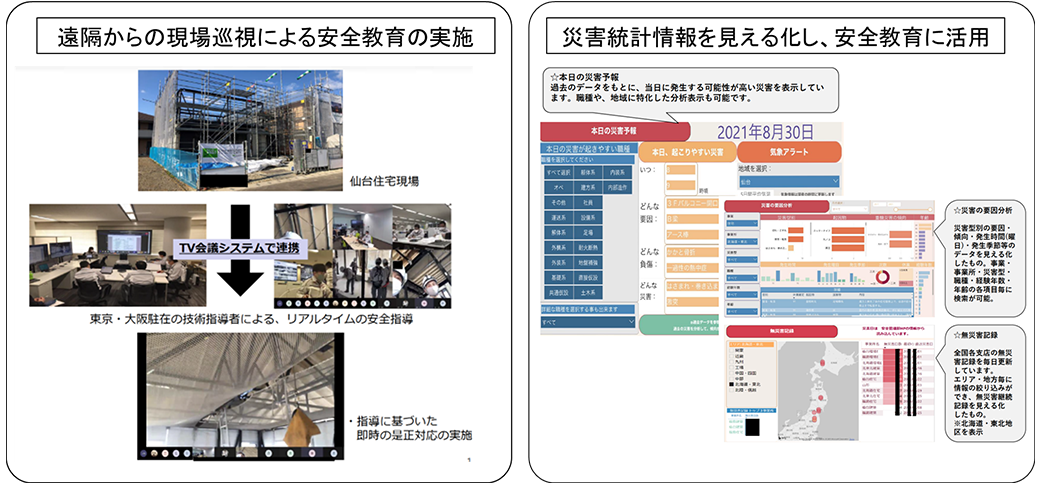 當(dāng)社では、現(xiàn)場関係者の施工情報共有や業(yè)務(wù)の効率化を目的として、施工擔(dān)當(dāng)者全員にスマートフォンやタブレットを配布し、全國の施工現(xiàn)場に定點カメラを設(shè)置しています。また、住宅事業(yè)本部では全國の地區(qū)母店12カ所にスマートコントロールセンター(SCC)を設(shè)置し、各地區(qū)の現(xiàn)場狀況の確認(rèn)や災(zāi)害時の指令拠點として活用しています。 その結(jié)果、工程の進(jìn)捗確認(rèn)や作業(yè)員への技術(shù)的な指導(dǎo)などが遠(yuǎn)隔で対応可能となり、複數(shù)の現(xiàn)場を巡回するなどの小規(guī)模な工事現(xiàn)場の監(jiān)督の業(yè)務(wù)効率約15%向上が確認(rèn)されたため、全國の戸建住宅の全施工現(xiàn)場にWEBカメラを標(biāo)準(zhǔn)設(shè)置することとしました。 また、複數(shù)の現(xiàn)場情報を集約して可視化することで、データに基づく分析や予測が可能になり、環(huán)境変化に対応したスピード感のある判斷を行えるようになりました。今後は「工程」「安全」「品質(zhì)」「コスト」「環(huán)境」など、これまで散在している情報を一元的に把握可能にして、ものづくりのプロセスにおける生産性向上を目指します。最終的には、施工現(xiàn)場情報だけではなく建物データや経営データとも連攜させ、ものづくりの現(xiàn)場と経営をリアルタイムに可視化し、データに基づく経営判斷のサポートができる仕組みづくりを目指します。 こうした取り組みの中で、スマートコントロール環(huán)境を用いた遠(yuǎn)隔からの現(xiàn)場巡視による安全教育の実施や、災(zāi)害統(tǒng)計情報を見える化した安全教育について、厚生労働省が主催する『「見える」安全活動コンクール』において優(yōu)良事例として選出されました。(図1)