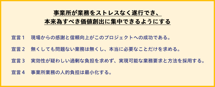 事業現場に本気で価値を創出するため、プロジェクト基本原則として以下の“プロジェクト宣言”を定め、これらの方針のもとに推進しています。