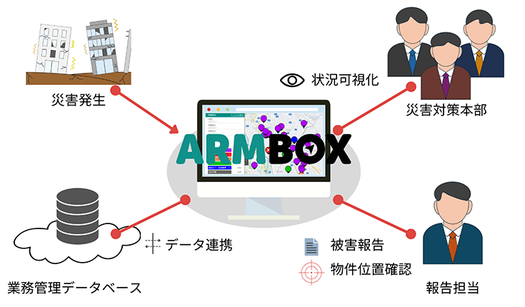 地図上から被災範囲を指定することで報告対象となる管理物件を特定し、該當物件の被害狀況報告をデータ登録することでリアルタイムに被害狀況を可視化出來る仕組みの構築を目指しました。また、登録された報告データを既存の業務管理データベースへ連攜させ、情報資産として管理?蓄積が出來るよう構想しました。