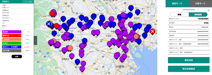 加えて、地震や津波などの災害が発生した際、地図上に管理物件が視覚化されていれば被災範囲の特定なども容易になり、報告?対応スピード向上を目的とし、地図情報を用いて物件を管理する仕組みづくりを行いました。