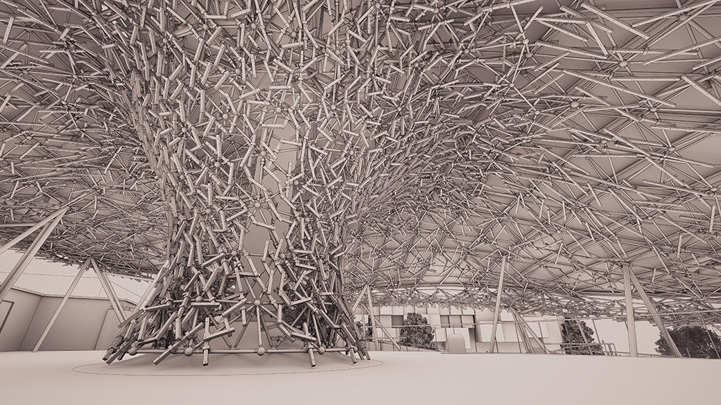 今回の建築物では、3次元に絡み合うような部材同士の接合や、ゆらいでみえるデザインの構築物を精度よく施工が可能になるよう図面化すること自體が課題でした。