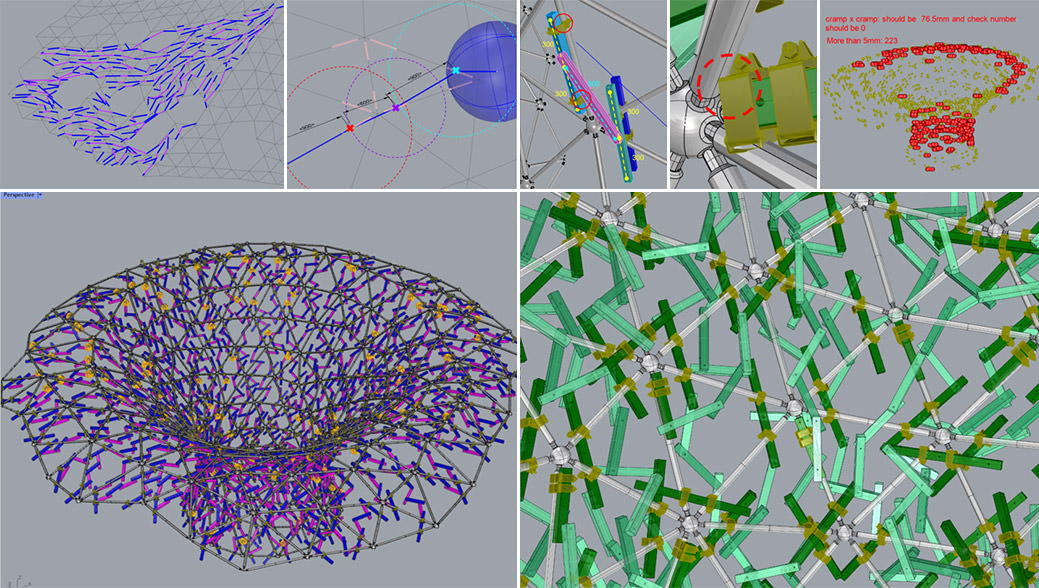 その複雑な曲面を持つ屋根や內部の木材の造形には、デザインの意図する方向性に沿えるようにするためには各段階で多數の課題があり、各検討モデルに対応したプログラムの作成や各種パラメーターの設定などを、どこかの段階でNGが出るたびに何度も何度も繰り返しその重要度や影響度を確認しながら、複雑な形狀をどうやって施工実現できるのかトライ&エラーを繰り返して積上げて、構造部材の応力解析や他部材との干渉チェックも並走して追いかけて、パースや動畫のほか、照明効果や屋根下の気流分析、施工手順や仮設材配置の検討まで3Dモデルでの検討にも活用しています。