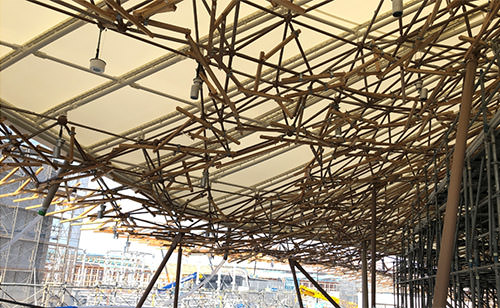 現在、すでに大屋根の架構や「創造の木」と呼ばれる木組の大半が施工完了し、部分的に照明の點燈試験を終えており、引き続きパビリオン內部の展示物の吊り下げ位置やその形狀、表示サインの見え方やそのデザイン、外観を覆う布狀の裝飾物など、継続して決定形狀を更新し、都度製作図との整合確認と反映を行っています。