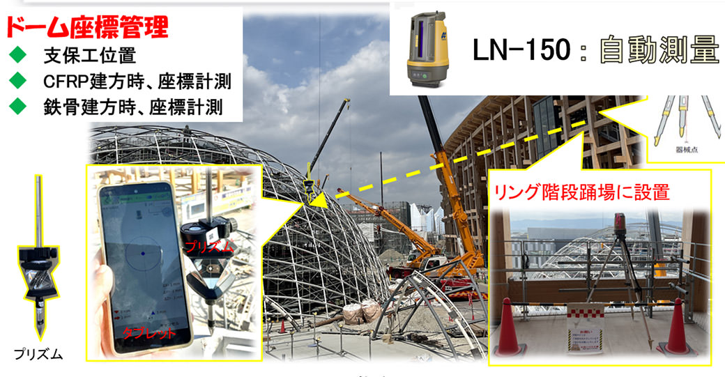 通常のXY方向の建入測定ではなく、XYZの3次元でドーム形狀の、建方精度を確保する為、少人數で管理できるツールで活用した、自動追尾の測量機を採用。外注の作業人工の削減します。