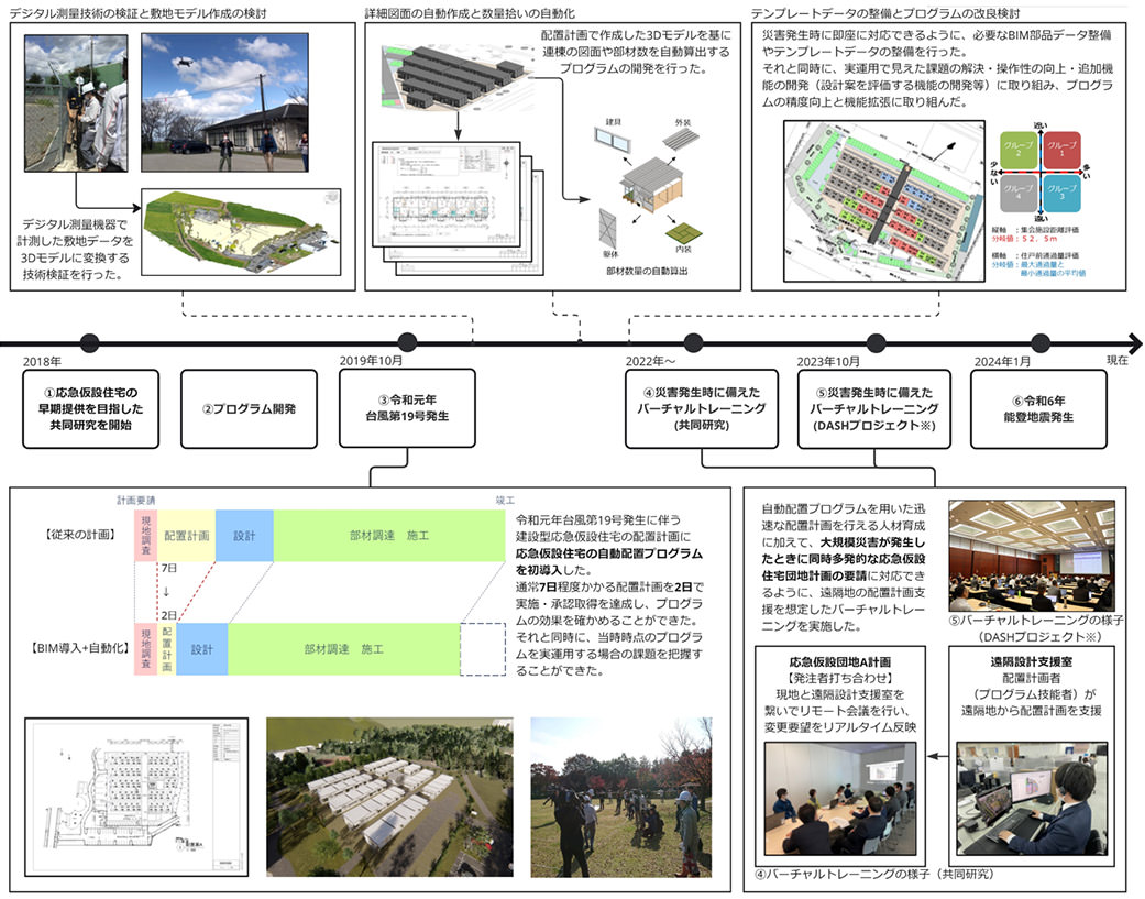 2019年臺(tái)風(fēng)第19號(hào)では、自動(dòng)プログラムを初導(dǎo)入した応急仮設(shè)住宅の配置計(jì)畫を行い、2日間での配置承認(rèn)取得を達(dá)成しました。その後も継続的にプログラムの改良とデータ整備を?qū)g施し、敷地測(cè)量技術(shù)の検証や建物の図面作成の自動(dòng)化も共同研究テーマとして、配置計(jì)畫前後のプロセス改善にも取り組んできました。また、遠(yuǎn)隔で応急仮設(shè)住宅の計(jì)畫を支援するバーチャルトレーニングを?qū)g施し、災(zāi)害発生に備えた支援體制の構(gòu)築を模索してきました。