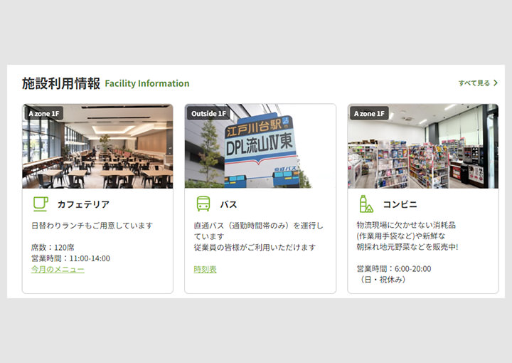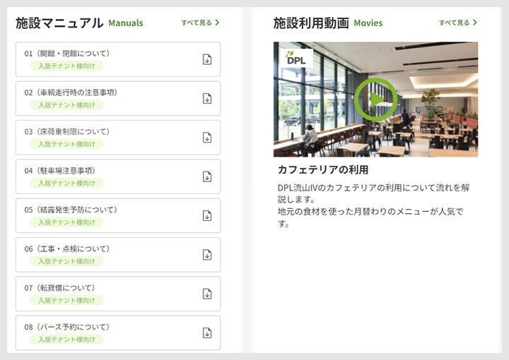 従來は、入居テナント企業からの物流施設に関する問い合わせには、建物管理會社の擔當が個別で対応していたほか、各種申請は紙ベースで行っていました。「DPL Portals」を使用することで、申請、問い合わせがパソコンやスマートフォンから行えるため、施設管理の効率化や迅速な対応が可能となりました。また、施設で働く従業員向けには、物流施設の利用マニュアル動畫やイベント情報が確認できるほか、送迎バスの時刻表など、現地に行かないと把握しづらい情報も、離れた場所から閲覧できるようになります。