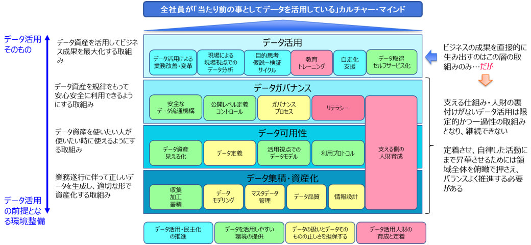 日常的に現(xiàn)場でデータが活用される狀態(tài)は、現(xiàn)場のデータ活用力を向上させる施策だけでは実現(xiàn)できません。必要な時に必要なデータが利用できる、安心安全に利用できるという前提が必要ですし、そもそもデータが集積され利用可能なデータ資産として整理されていなければなりません。