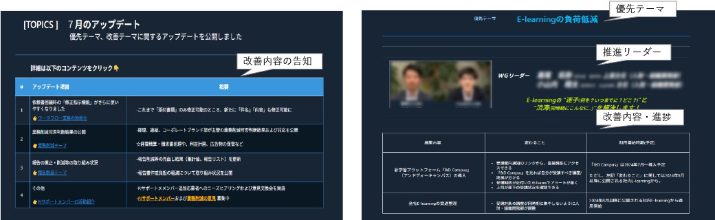 既に著手、実裝できた改善內容については、プロジェクトの社內共有サイトで公表し、隨時、現場の評価やフィードバックを受けながら、事業現場が実感できる改善となるように取り組みをアップデートしています。