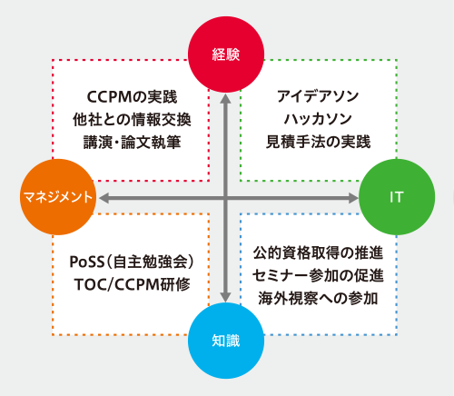 デジタル戦略部門では、ゼネラリストとしてのマネジメント人財と、スペシャリストとしての高度IT人財の両方が必要です。マネジメント人財として能力の幅と深さをバランスよく成長させるか、高度IT人財として技術に特化して成長させるか、個人個人の資質に合わせて育成します。育成にあたっては、座學だけでなく実踐する場を與えることを重視して進めています。