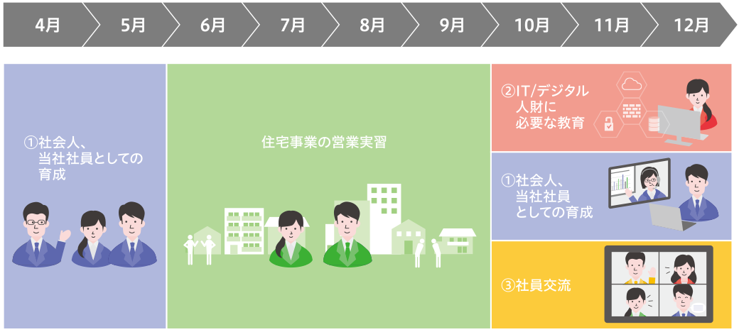 基礎教育としての「①社會人、當社社員としての教育」。これからのIT/デジタル人財に必要とされるスキルを再定義した専門教育としての「②IT/デジタル人財に必要な教育」。テレワークにおいても社員間のコミュニケーション量を増やし、多くの先輩社員から価値観や仕事に対する姿勢を生の聲から吸収するための「③社員交流」。以上、3つのカテゴリと全社的に実施される「住宅事業の営業実習」を加えて新入社員教育を実施しています。これらの各種教育は、教育を実施する側と受けた側のフィードバックを隨時行っており、毎年継続的な改善につなげられるよう運用しています。(図3)