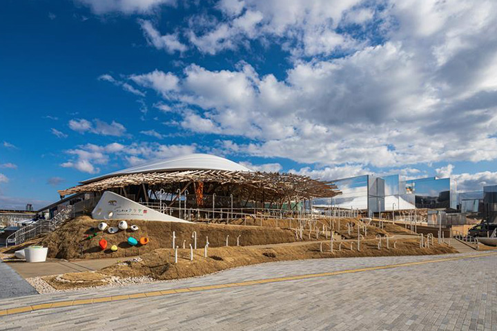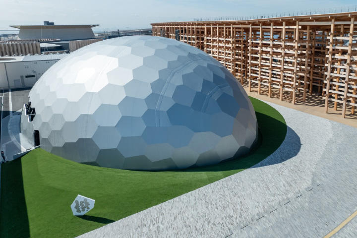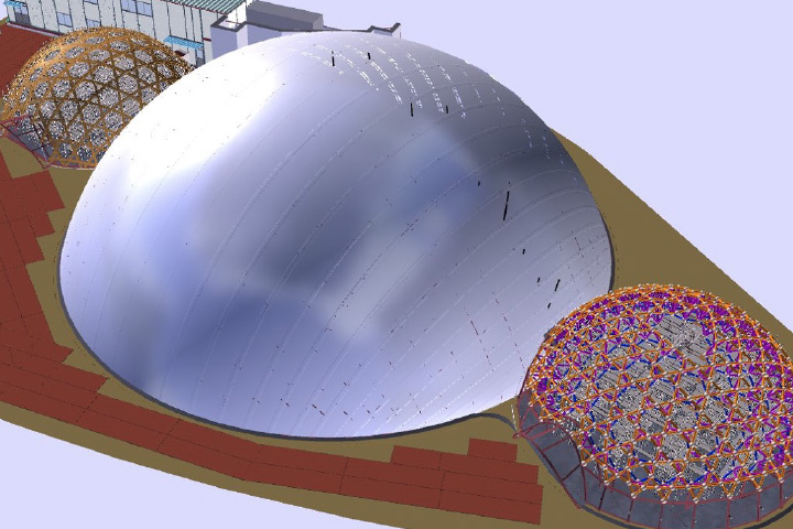球體上の各棟を竹、紙、炭素繊維とプラスティックの複合材など異なる素材で施工する建築物です。BIMの活用により、難易度の高い設計?施工を可能にしています。