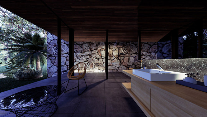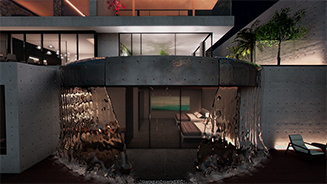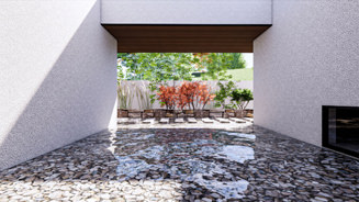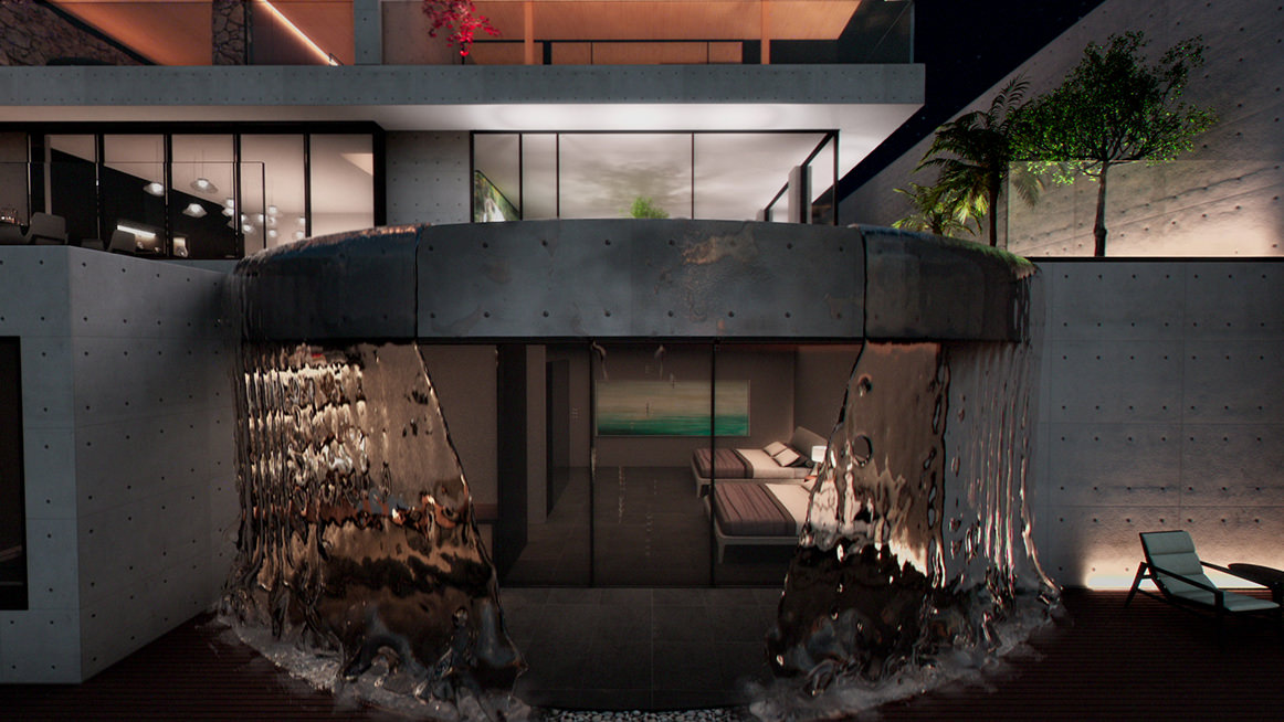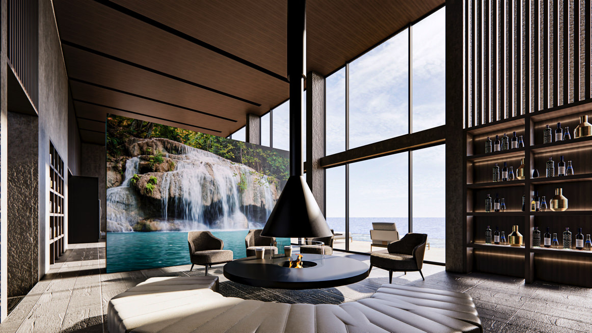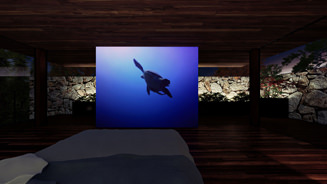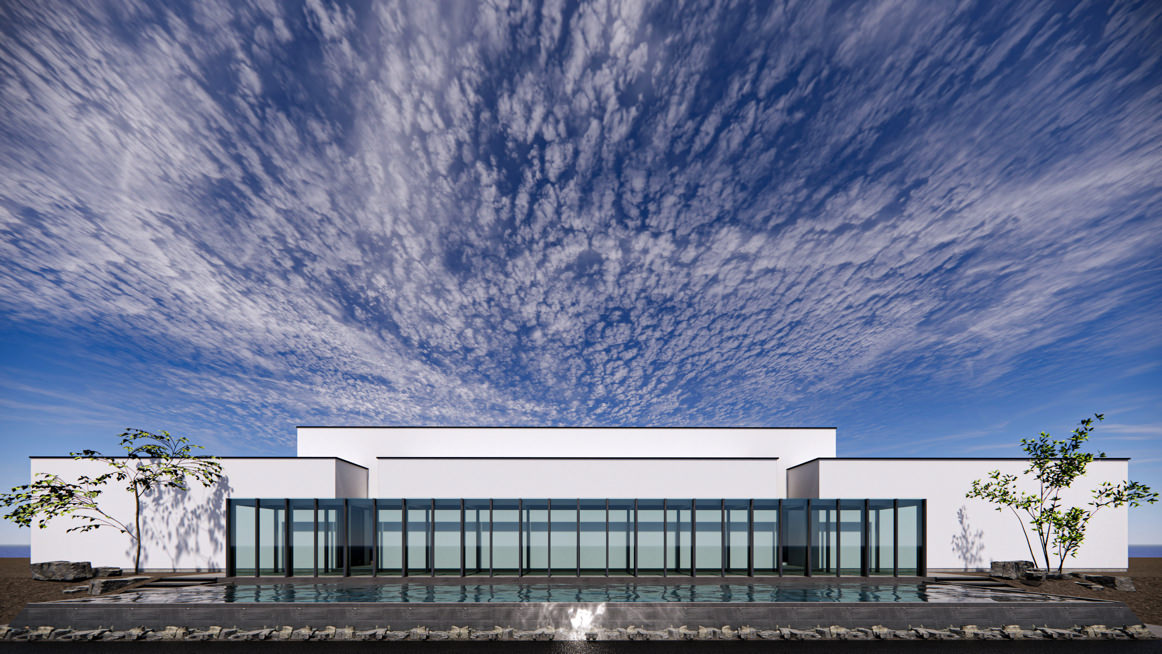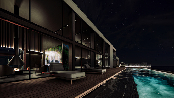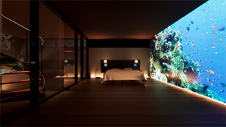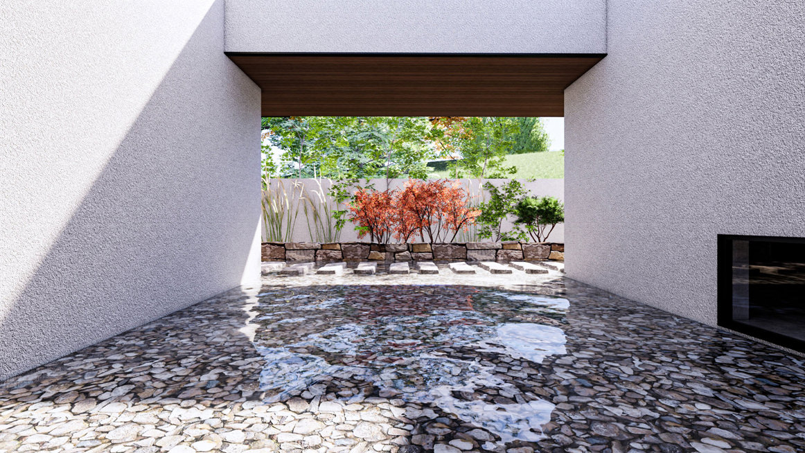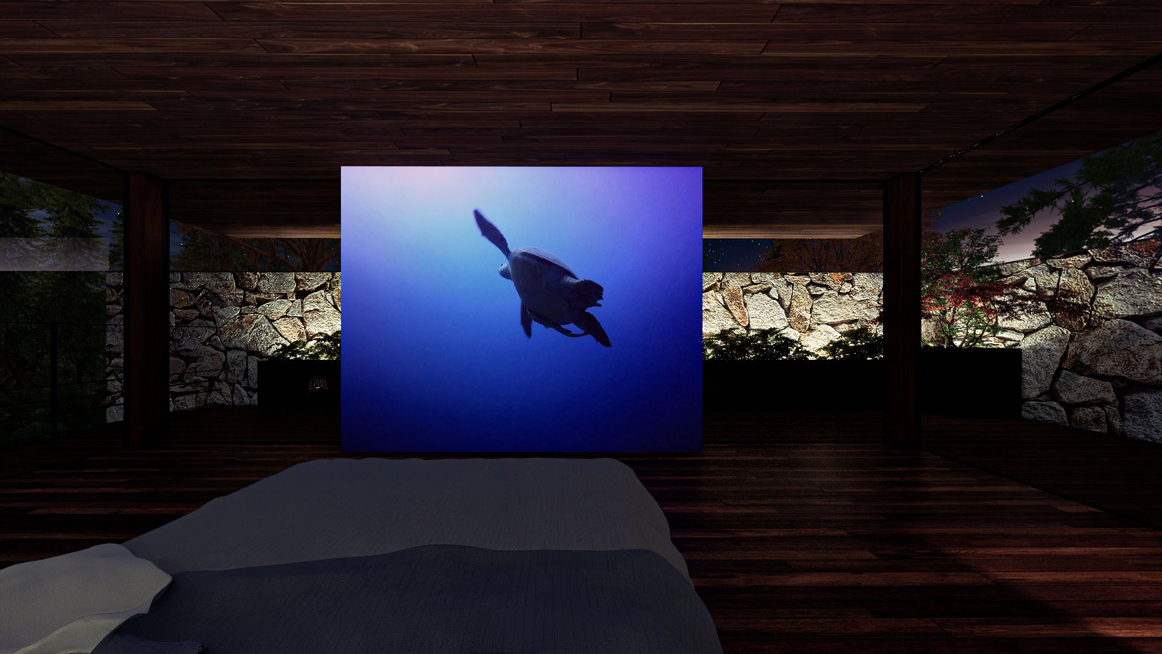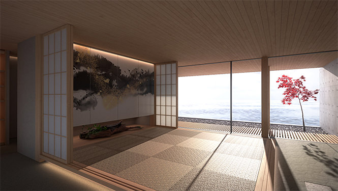 そこに置いたのは4つの白い箱。前後には水面。まるで水に浮かんでいるかのような空間で、非日常的な體験ができる別荘を描き出した。