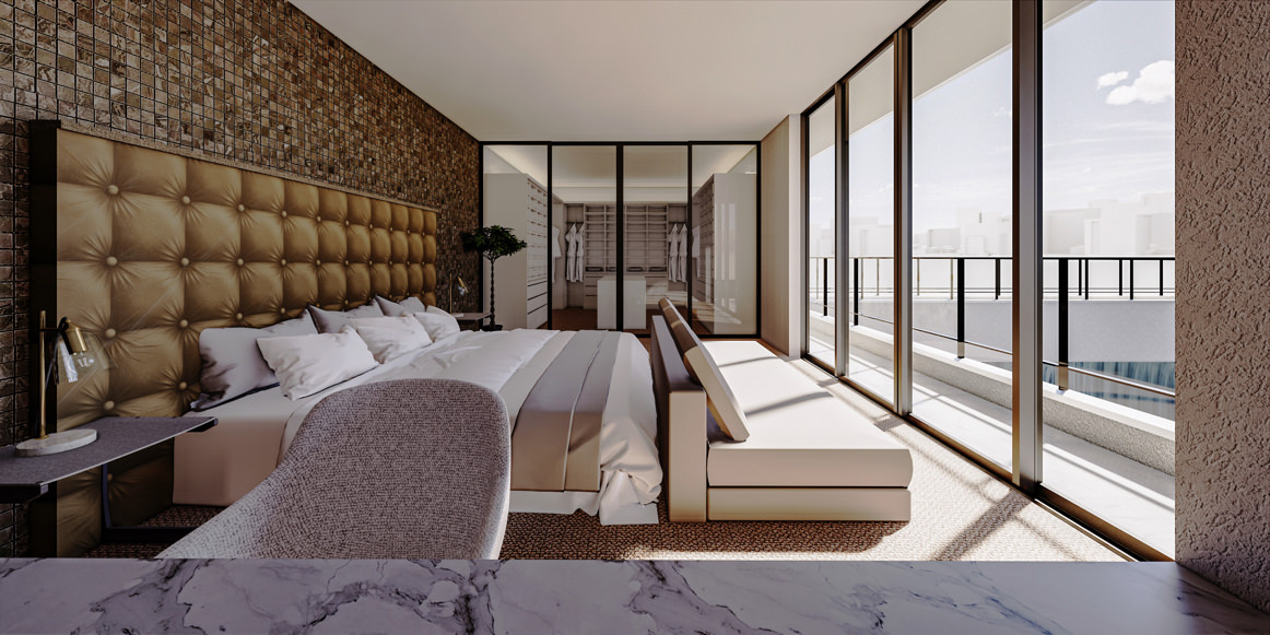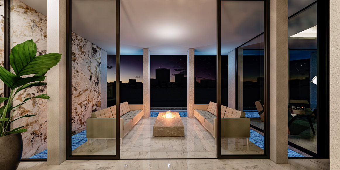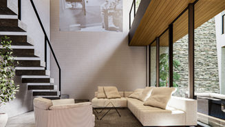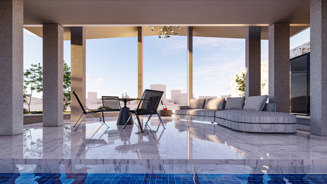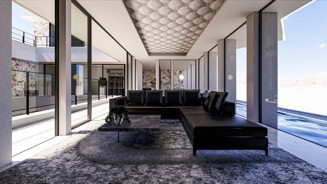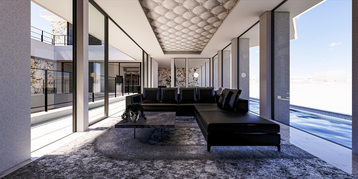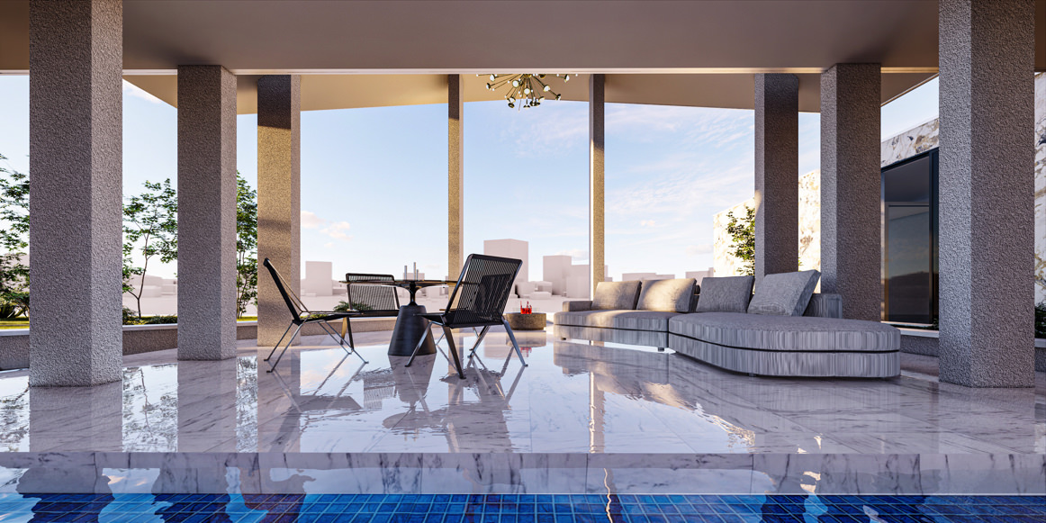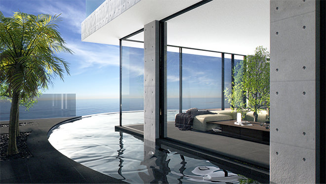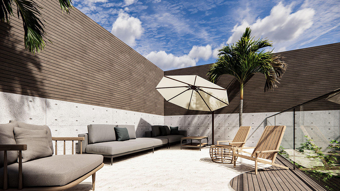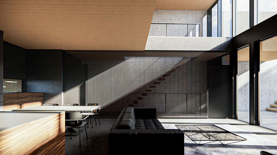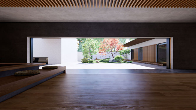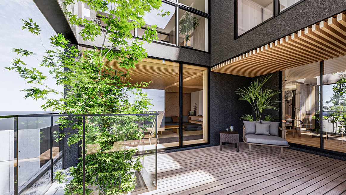 両サイドの重厚なRC壁によりプライバシー性に配慮、あらゆる空間から眺望を心おきなく愉しめるプランニングに。