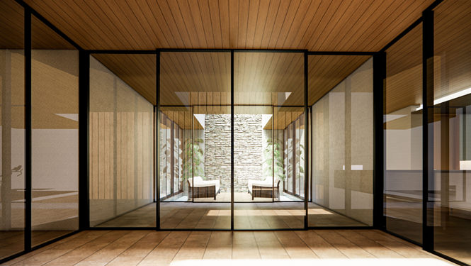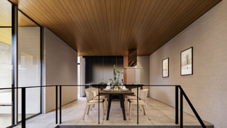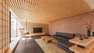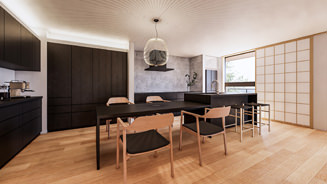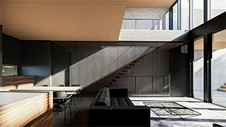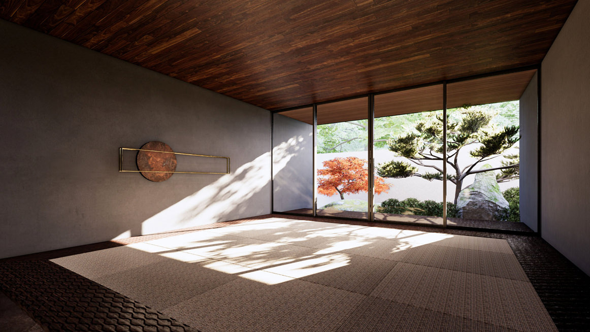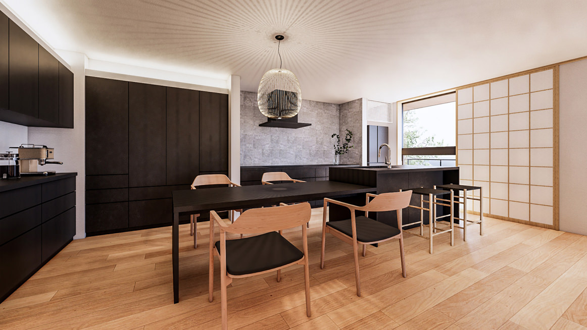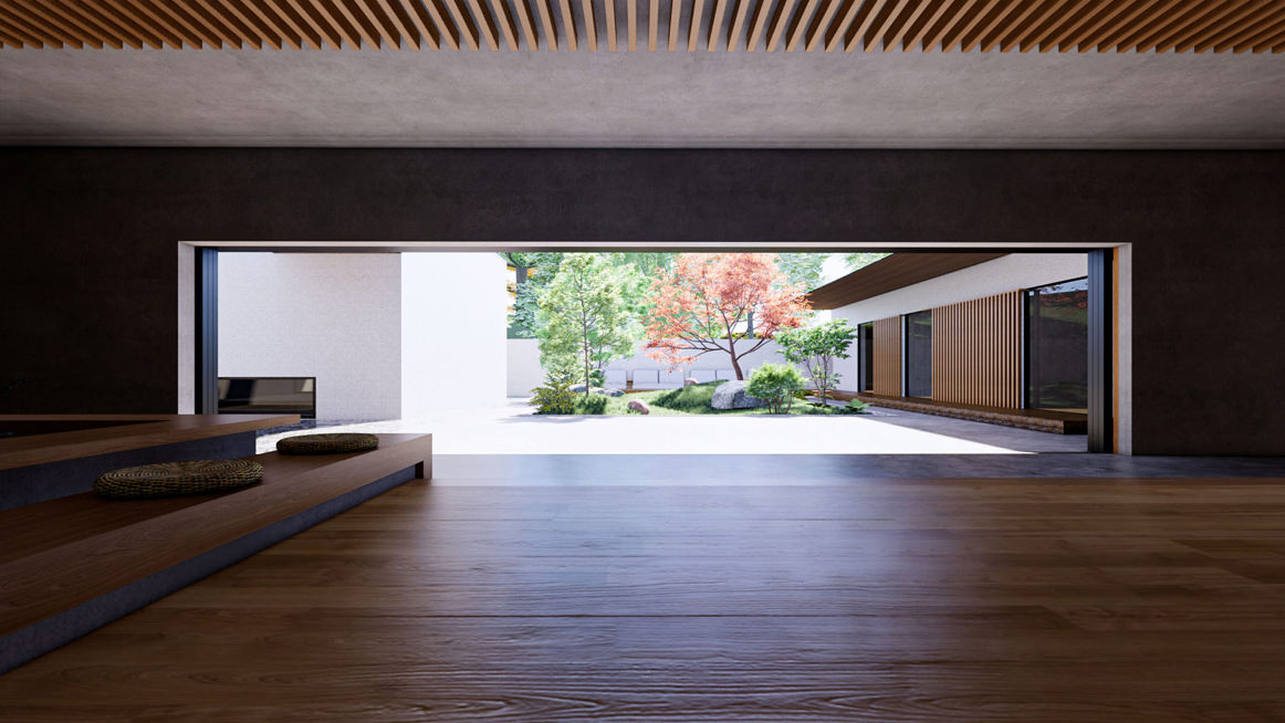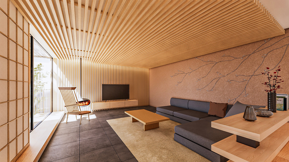 高さを抑えた開口や囲爐裏など、重心を低く感じられる要素を配置し、日本人にとって居心地のいい「低さ」を堪能できる邸宅を描いた。