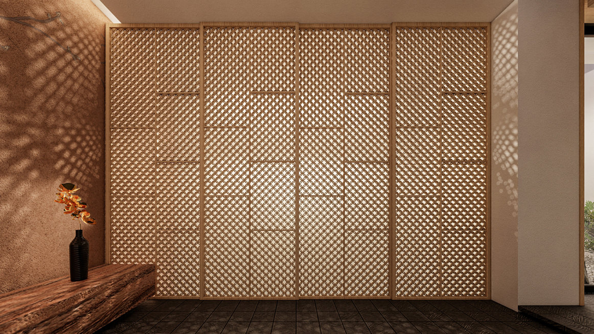 そこから続く空間は、都會の喧騒を忘れさせながら、五感を刺激する癒やしの和的空間をデザインした。