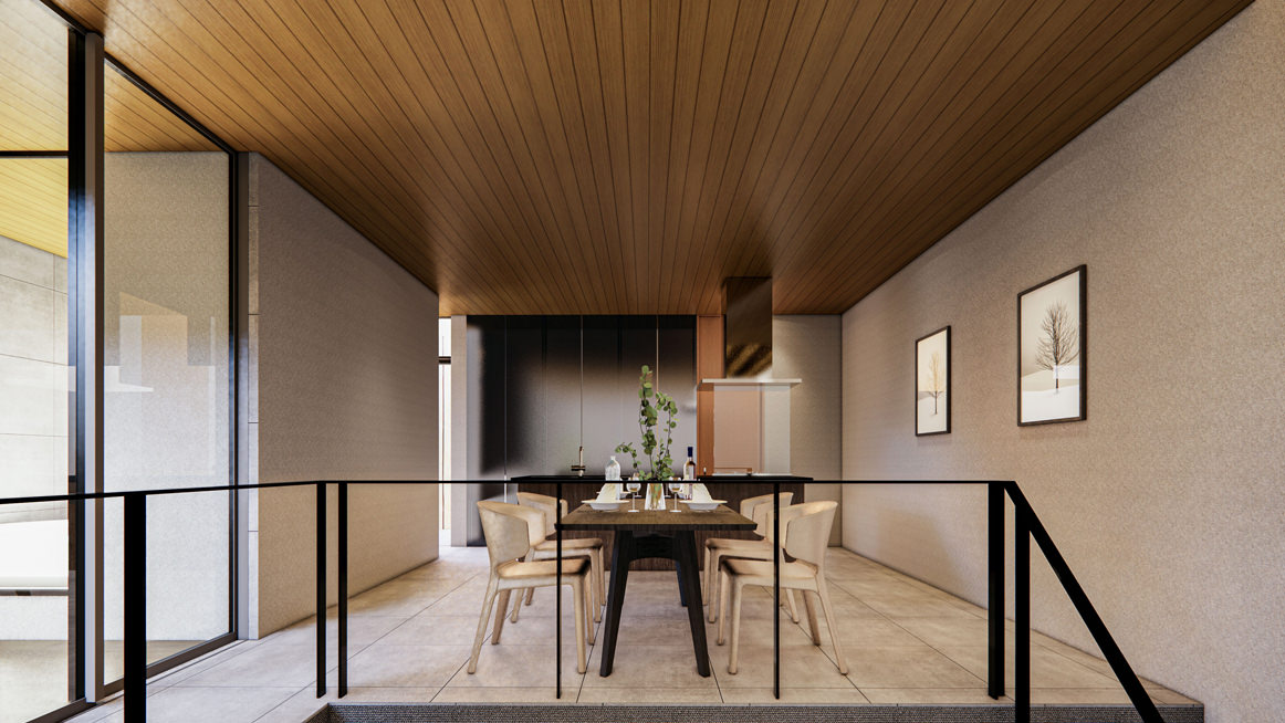 緑陰に包まれて大地と一體化するリビング、吹き抜けから光が降り注ぐダイニング、パノラマの空を望むワークスペース。それらを相互に接続し、多様な居心地を有機的につなげている。