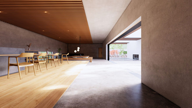エントランスから続く屋內のメイン動線は土間仕上げとし、屋內にいながらも屋外を散策するような心地よさを味わえる。