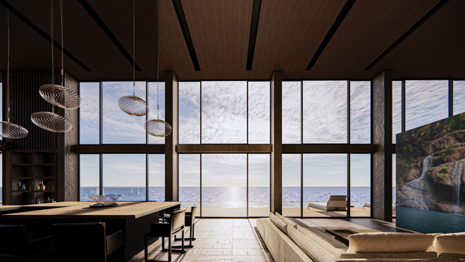 住宅の概念を捨て、スケールアウトした大空間は、「空」と「海」をテーマに、大自然を満喫できる居場所となった。