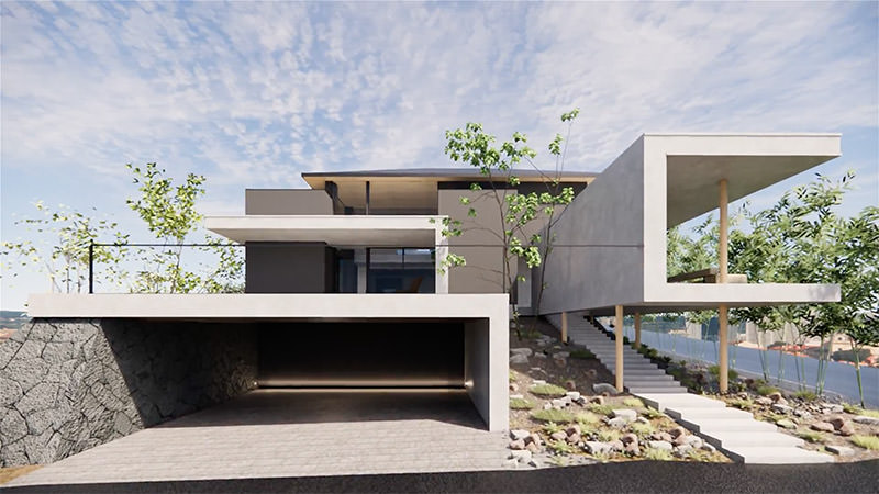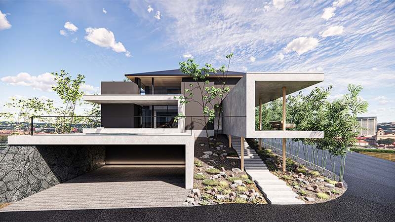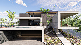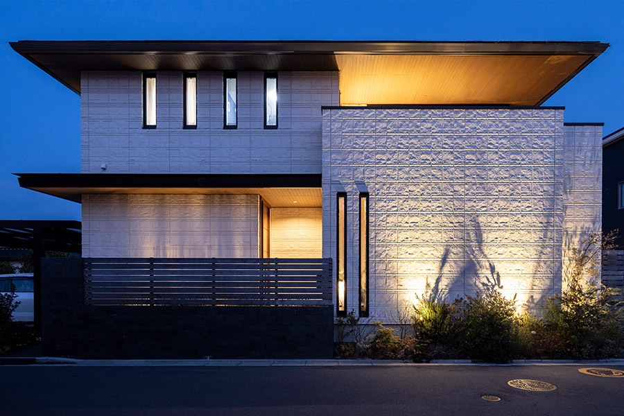 高低差のある郊外敷地に建つ邸宅。外部に対して閉じすぎず開きすぎない創造性の豊かな外観。