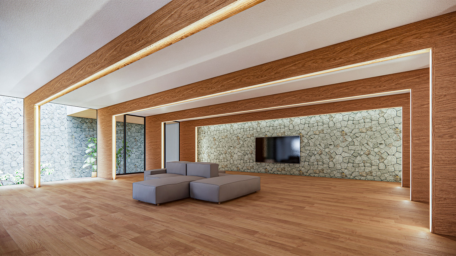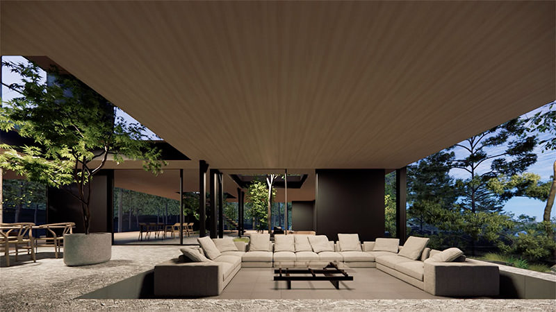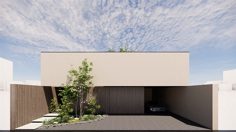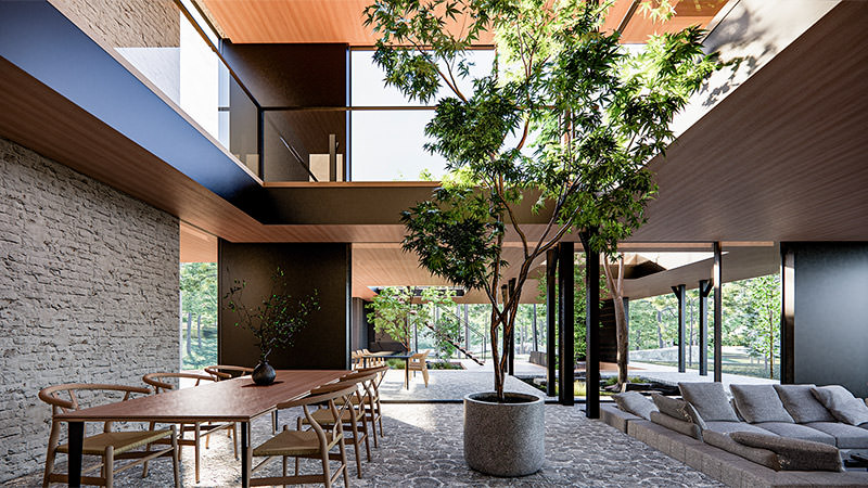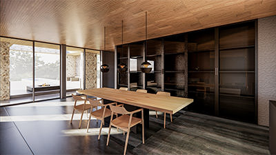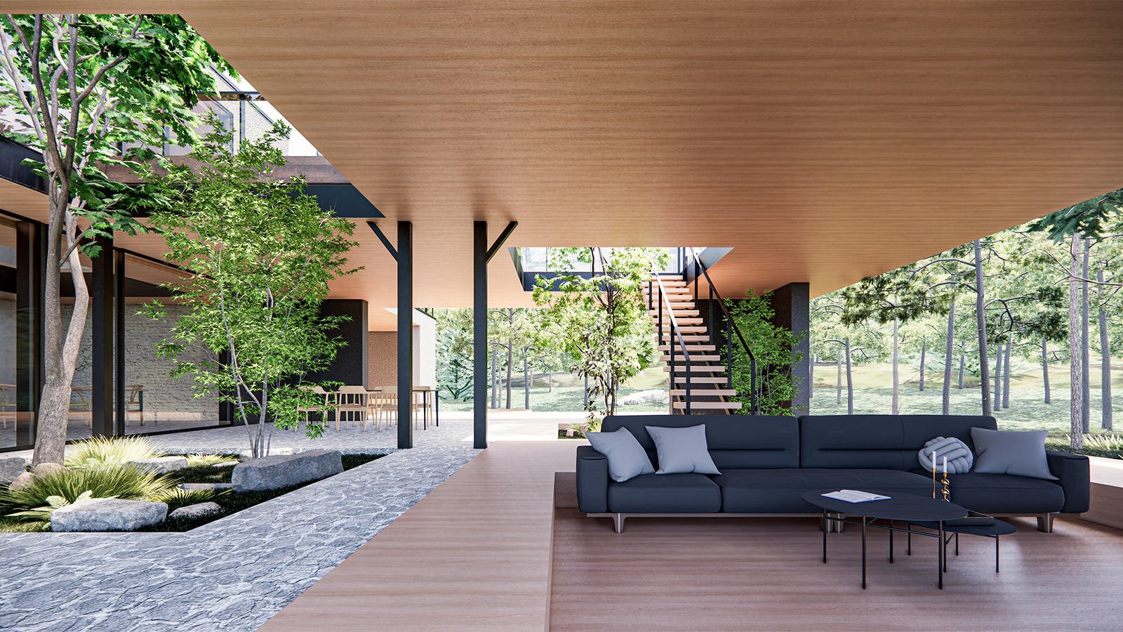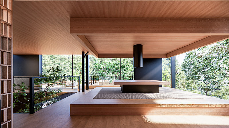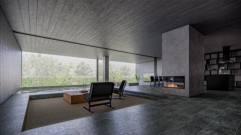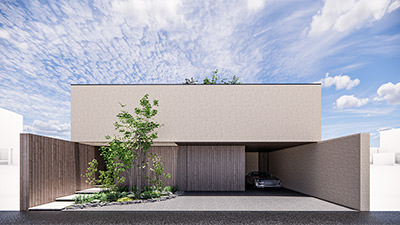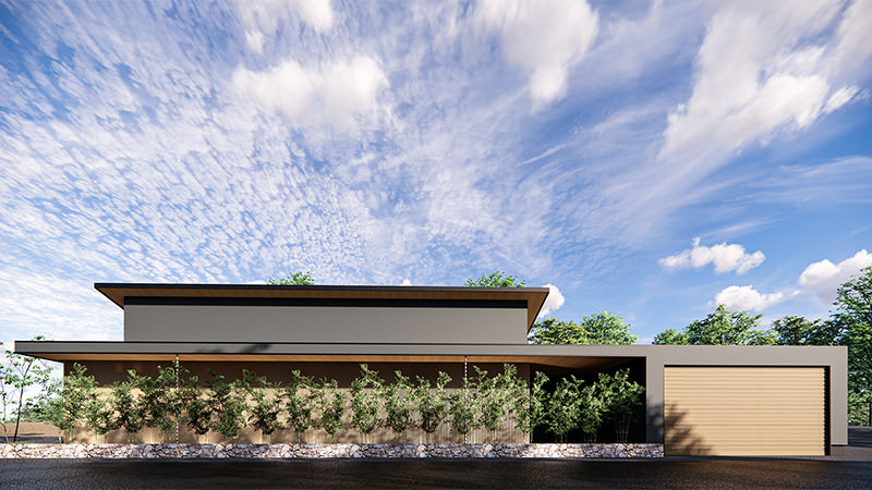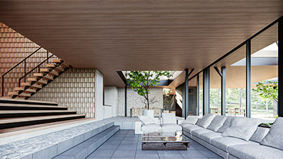 自然と建物が互いに引き立て合い、囲われる安心感の中に開放感が味わえるような暮らしを提案する。