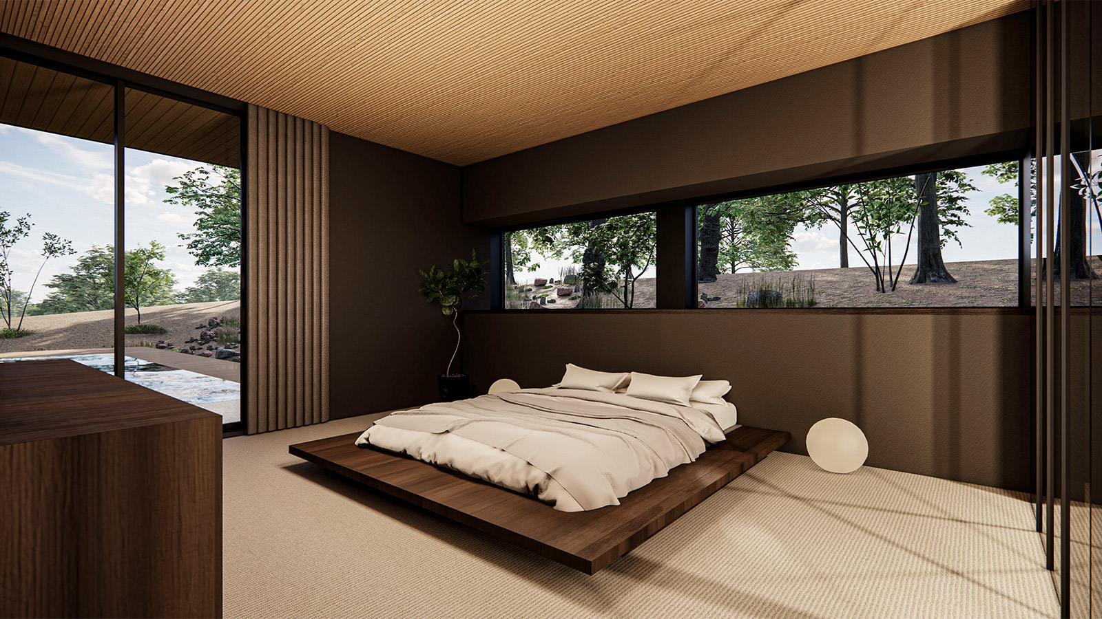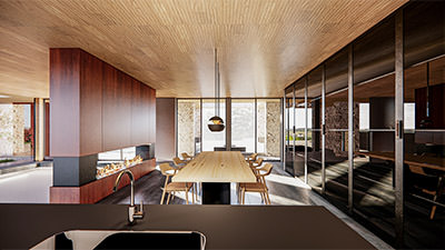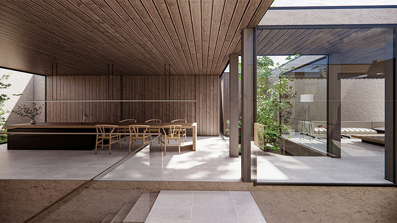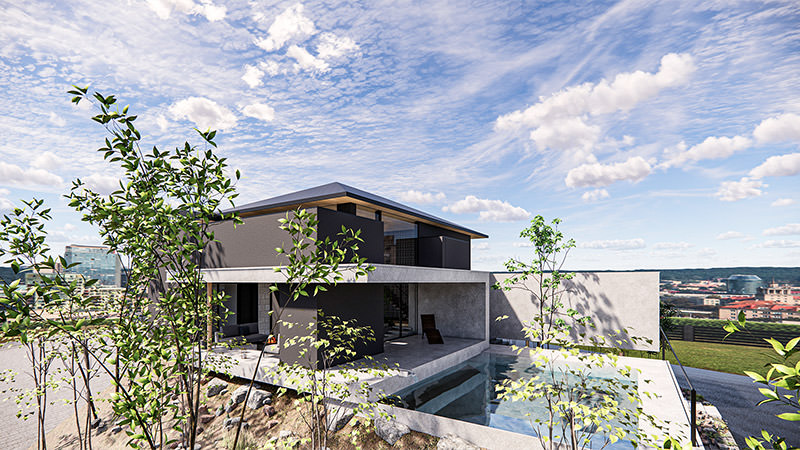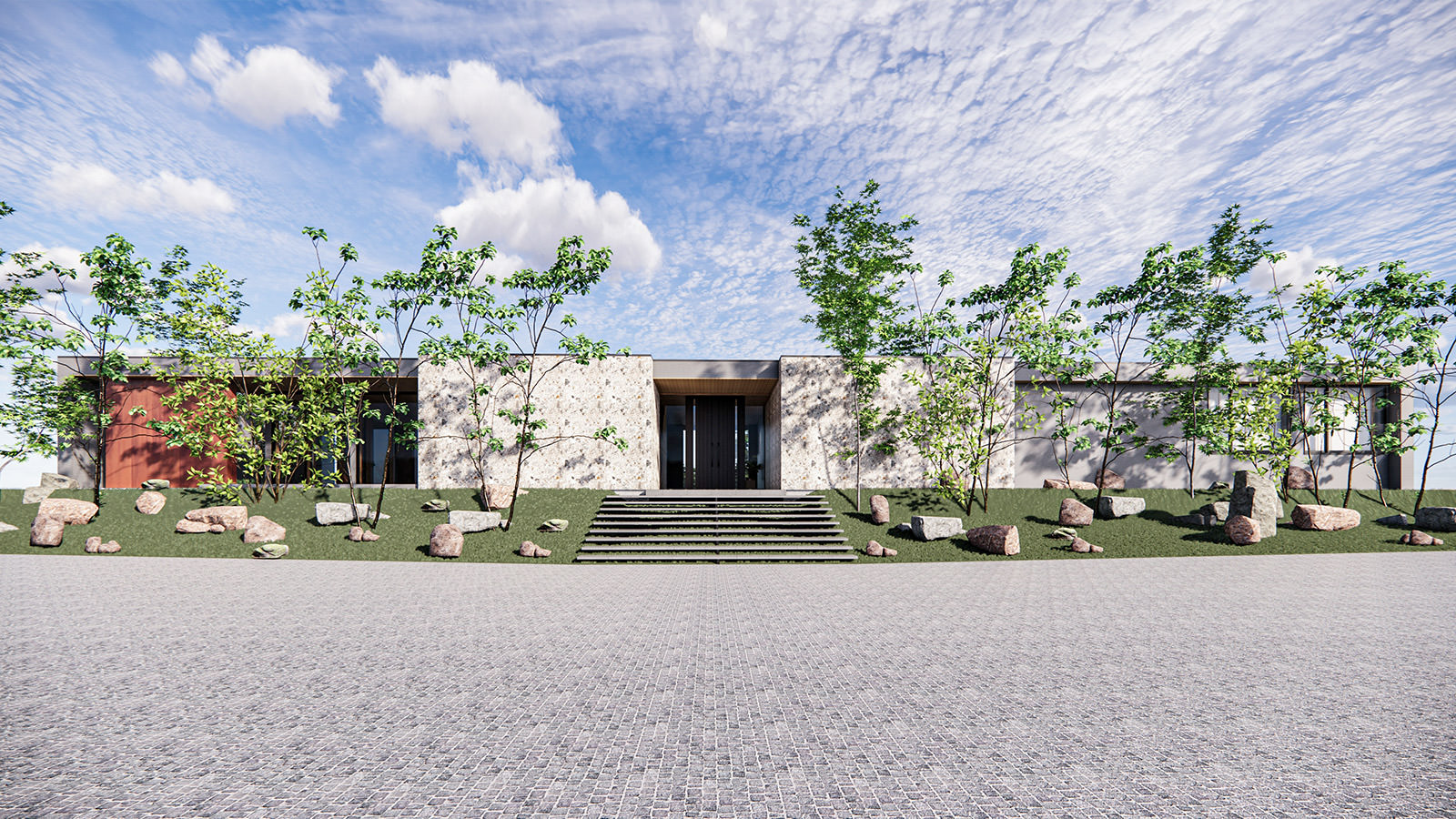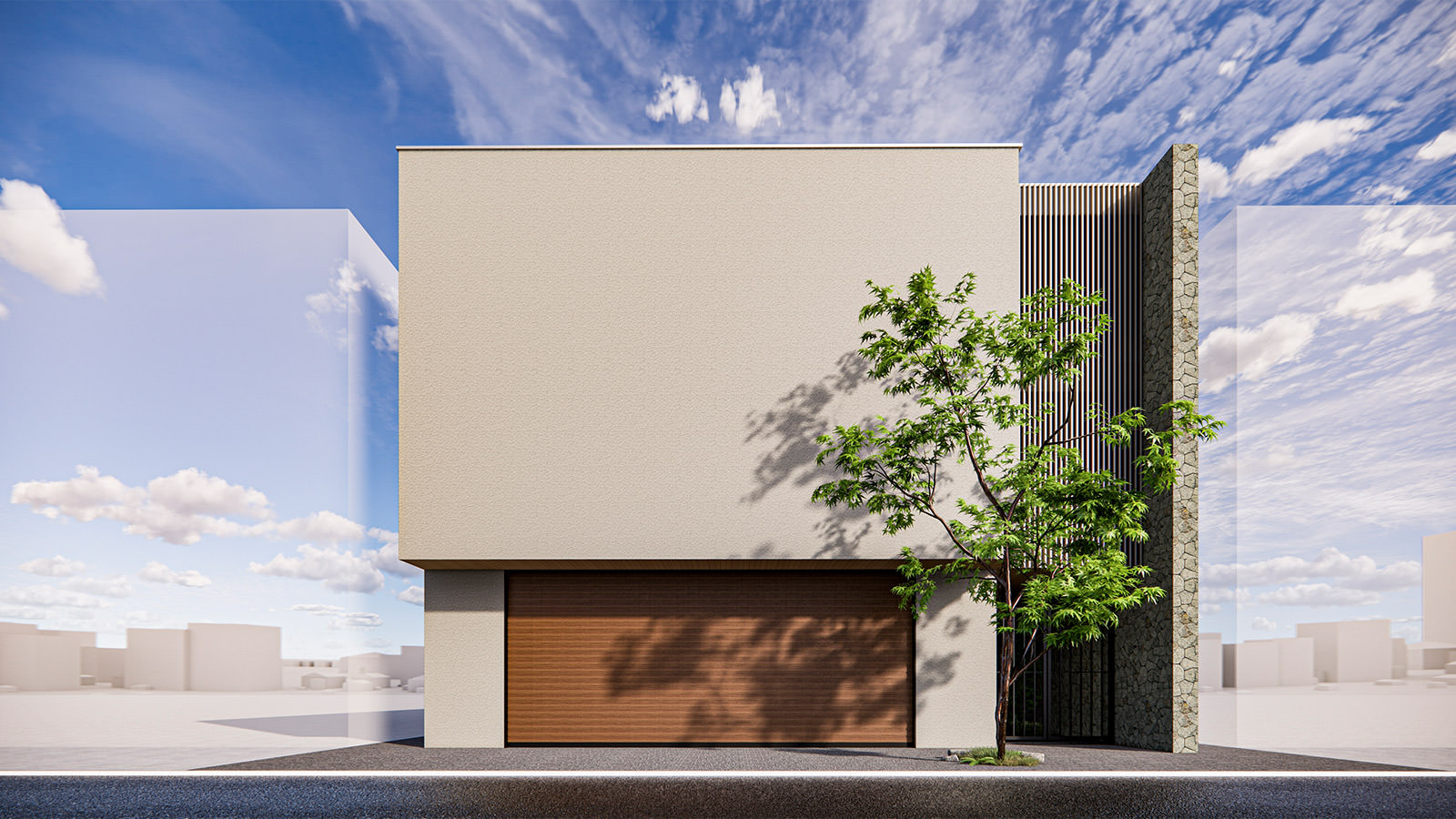 自然と建物が互いに引き立て合い、囲われる安心感の中に開放感が味わえるような暮らしを提案する。
