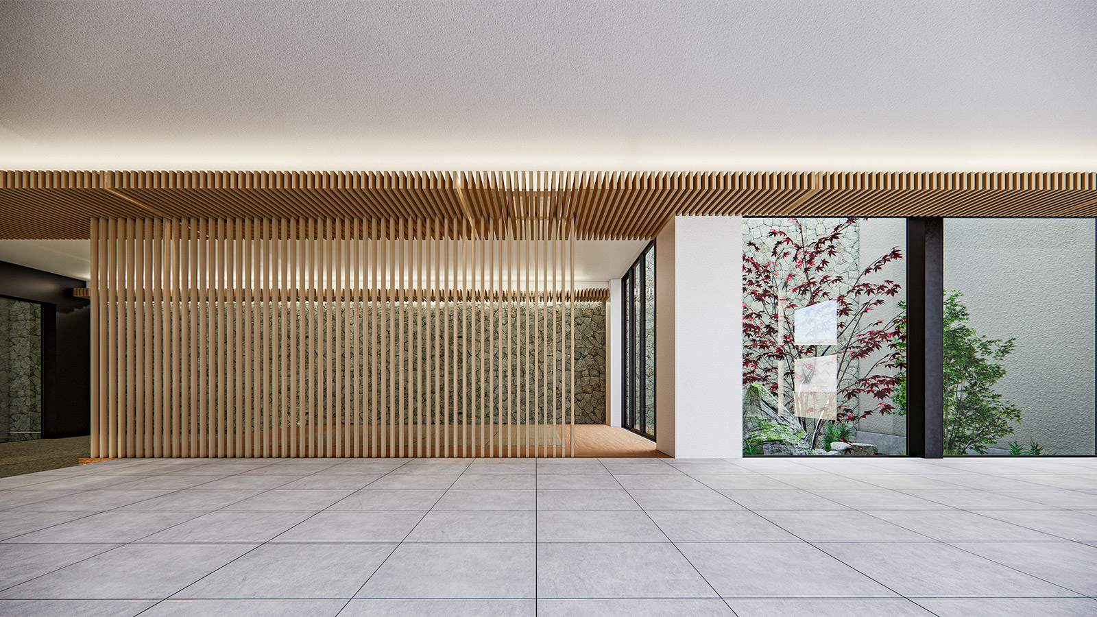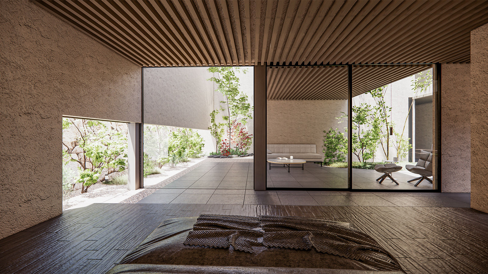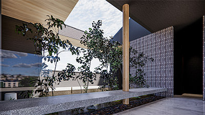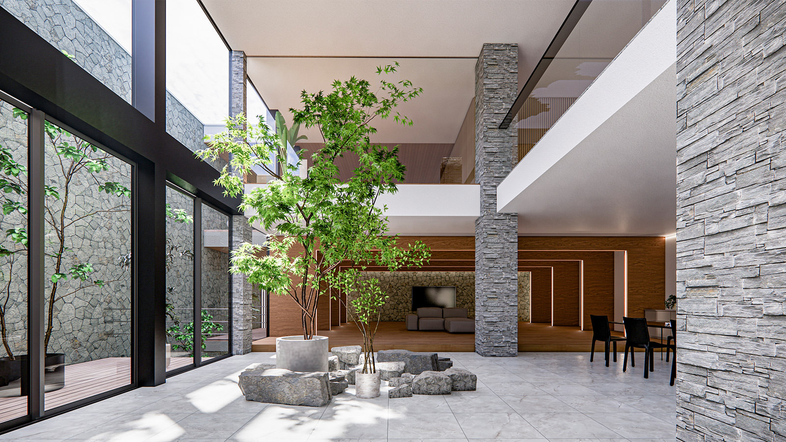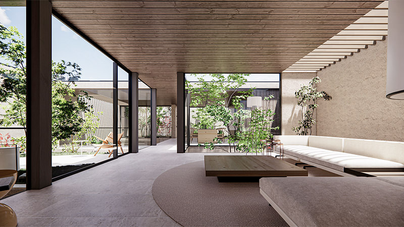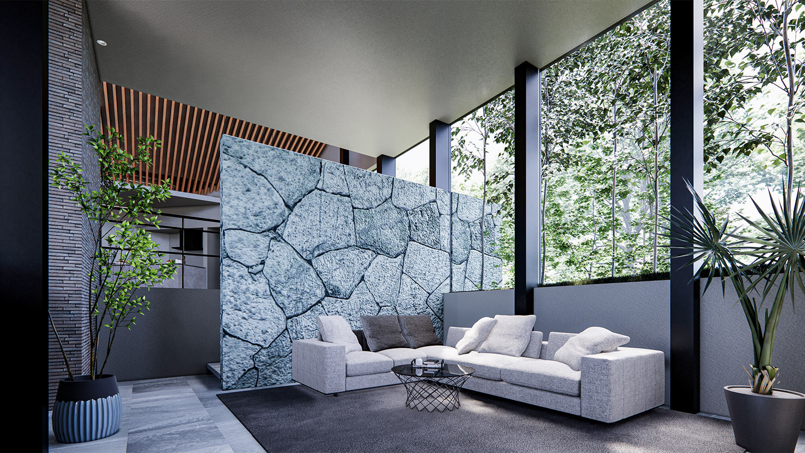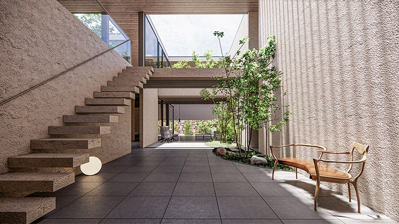 居住空間からは樹木や石などの自然素材を望むことができ、都市にいながら日々自然を感じ暮らすことができる空間とした。