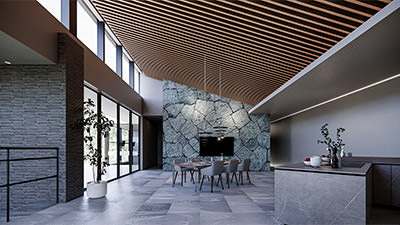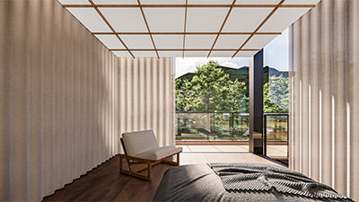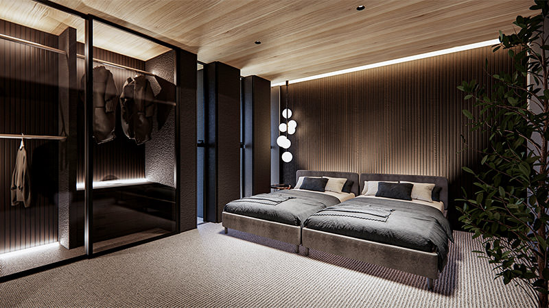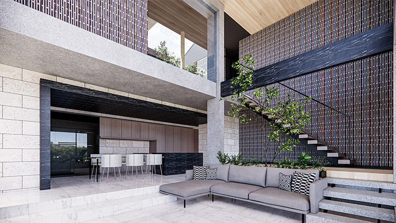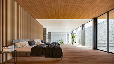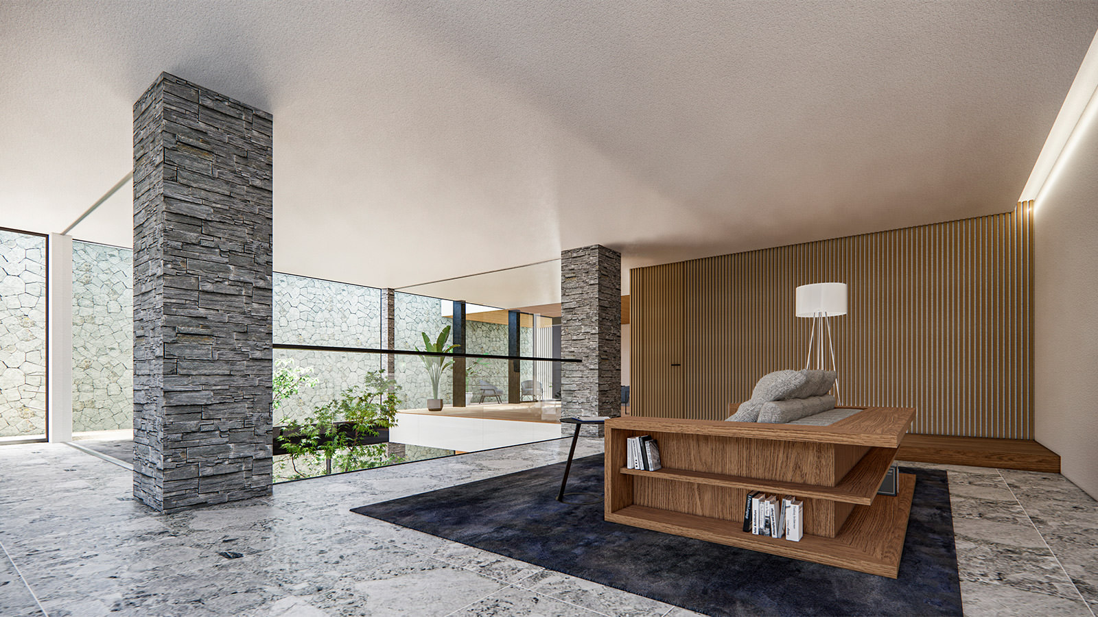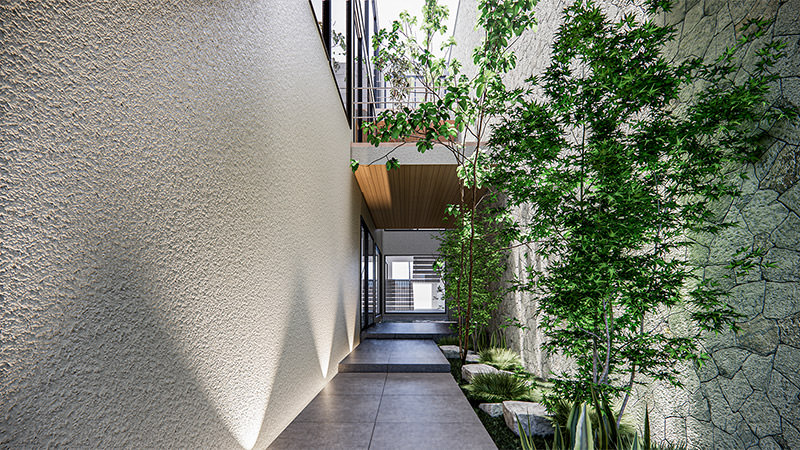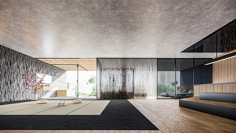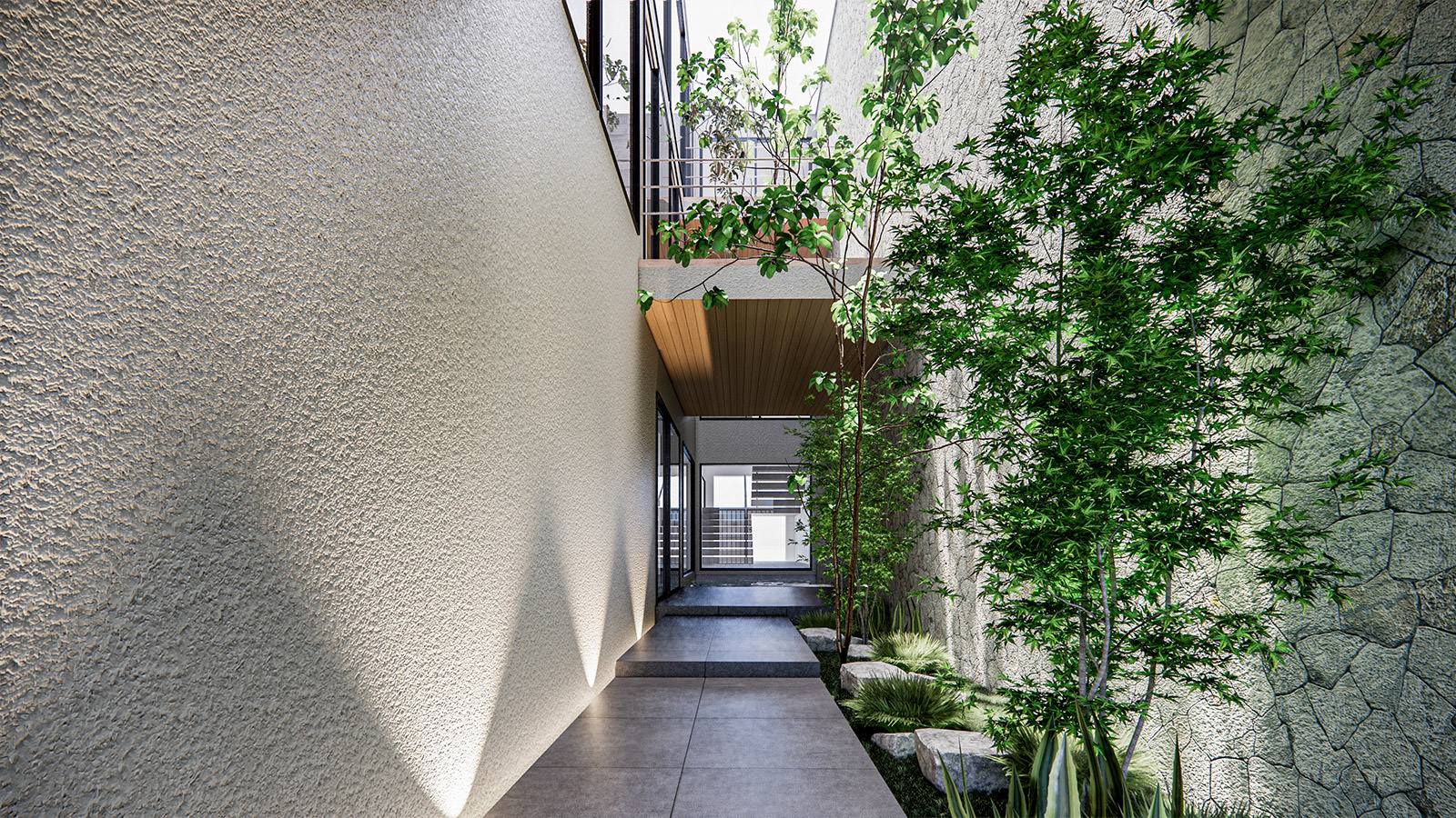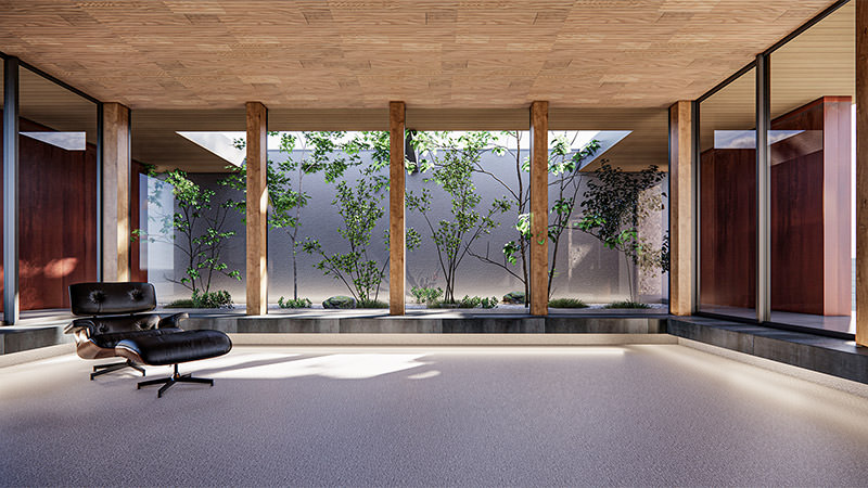 居住空間からは樹木や石などの自然素材を望むことができ、都市にいながら日々自然を感じ暮らすことができる空間とした。