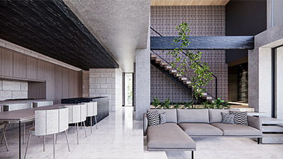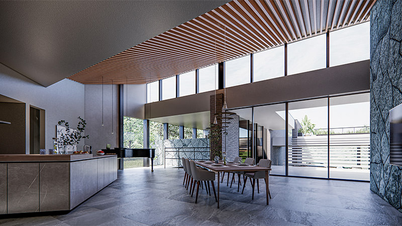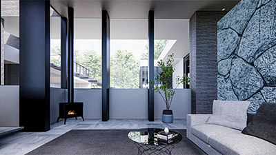 內外部のつながる空間は景観を引き込む豊かな空間になります。外部に大きく開かれた開口は四季を感じることができます。また大きな吹き抜けは家族がどこにいても、それぞれの居場所が心地よく感じられる空間づくりで上質で豊かな暮らしを體験できます。