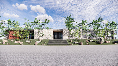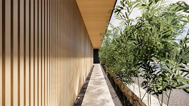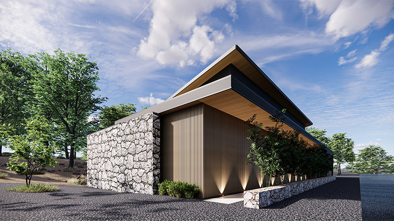 建物を自然素材と植栽でまとうことで自然に溶け込む。