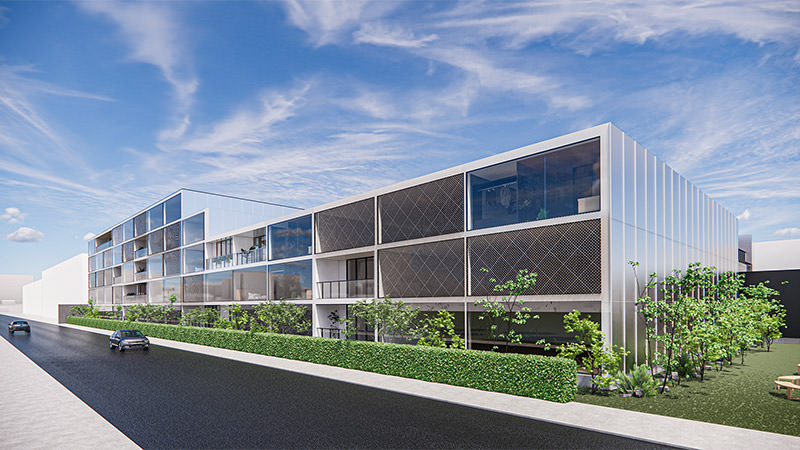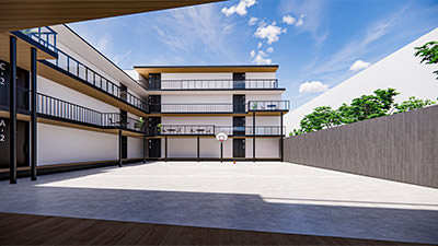 都心郊外の集合住宅。集合住宅の典型的な共用廊下とバルコニーに囲まれた住戸ではなく、戸建てのようにさまざまなキャラクター性を持つ住戸を集合させる計畫とした。