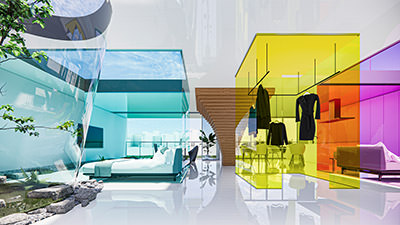 「石」「和」「ガラス」などのコンセプトを持つ住戸とバルコニーがプールや坪庭などに変わることで、豊かな生活空間を提案。外観の大きなボリュームは、住戸の明かりのつき方により、その時間ごとに街並みの風景に変化を與える。