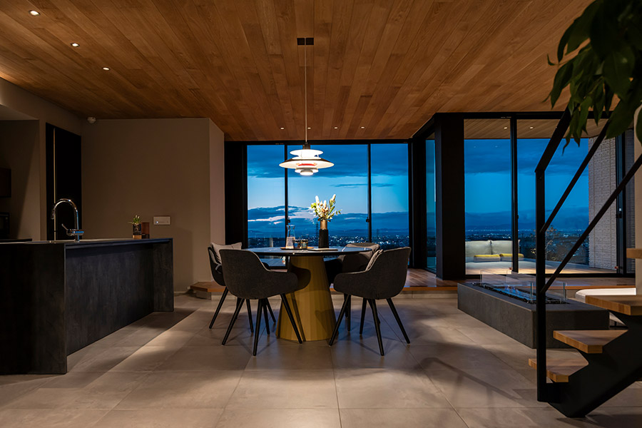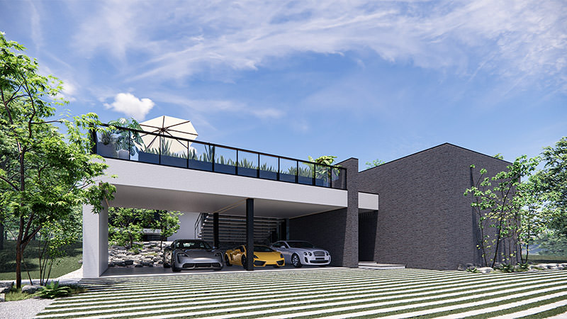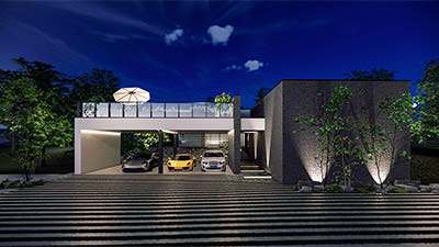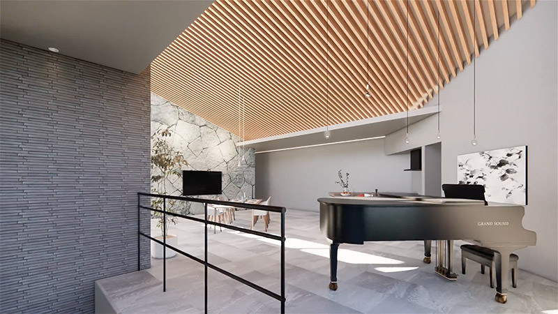 道路から奧に向かって高くなる敷地に対して、地中に半分の生活空間を配置することで、自然との調和を感じながら快適な暮らしを実現できます。立體的な空間や開放感、自然との一體感を重視したデザインが特徴となっています。ダイニングからつながるスカイガーデンで、屋內と屋外の融合を體感できるのも魅力です。